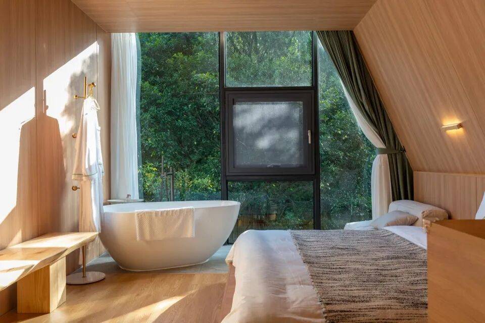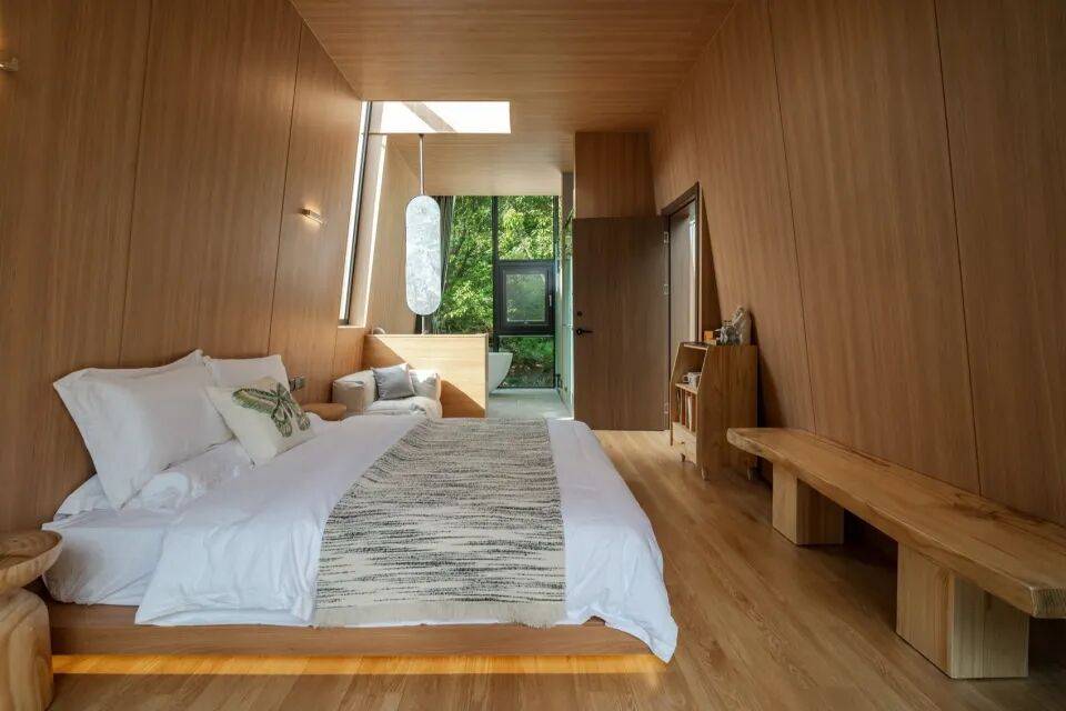 有机散落:建筑依据地形与植被间隙自然错落,每栋客房拥有独立私密性,同时窗外皆是独一无二的森林画卷;