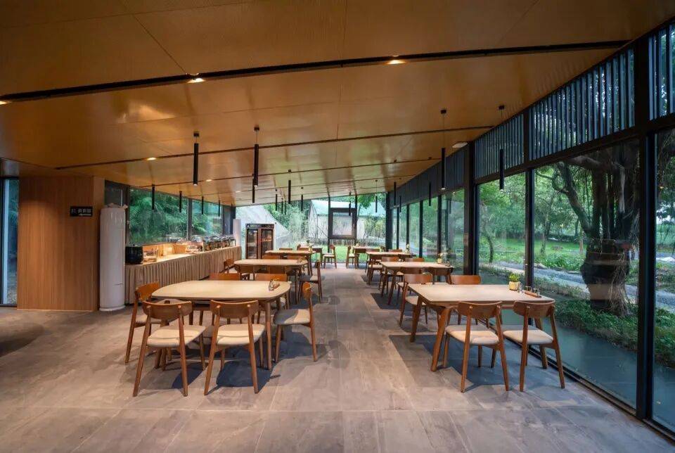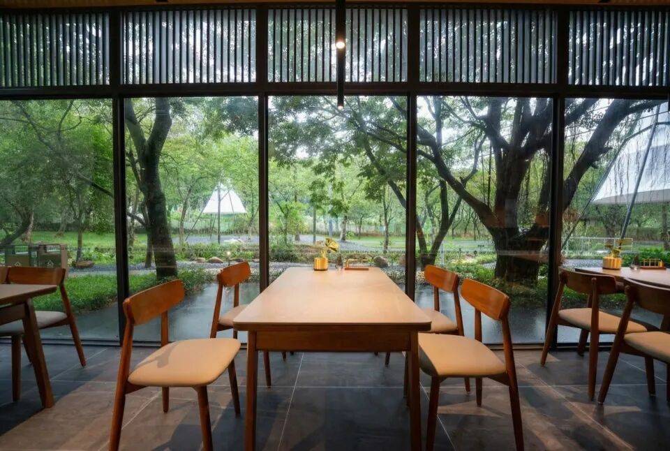 绿意入席:落地玻璃模糊室内外界限,引溪风树声入帐,就餐成为与自然对话的仪式。