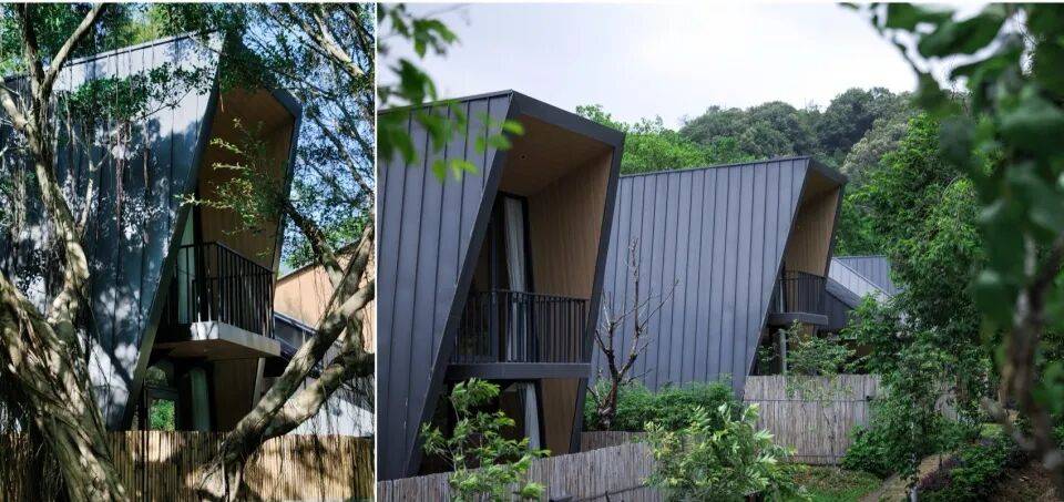 客房建筑采用铝镁锰金属板、炭晶板等深色材质,形成“墨匣”般的视觉效果: