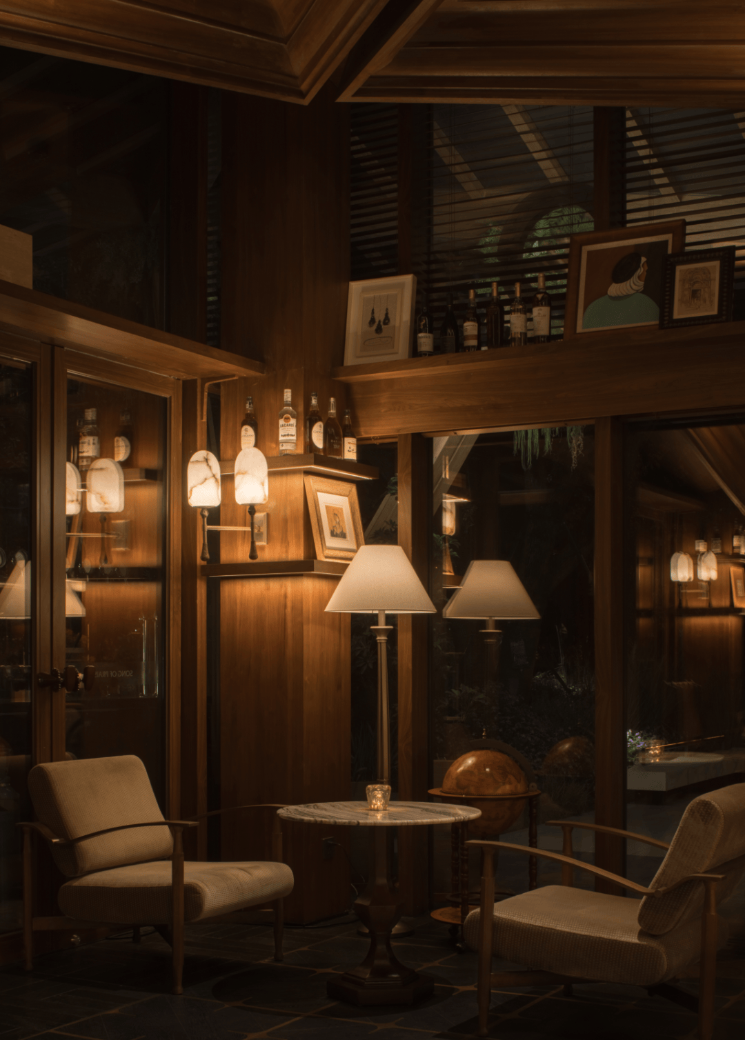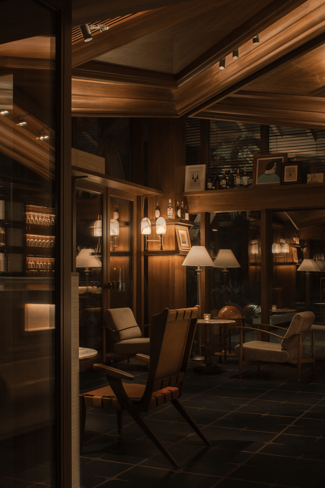 克制中见轻松:木质界面与暖调灯光构成稳定背景,吧台石材拼贴、墙面线条重组等细节在秩序中带来意外感;