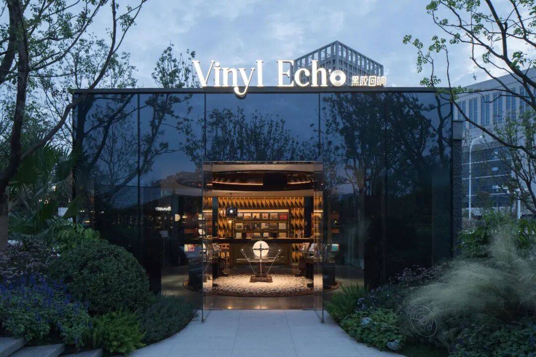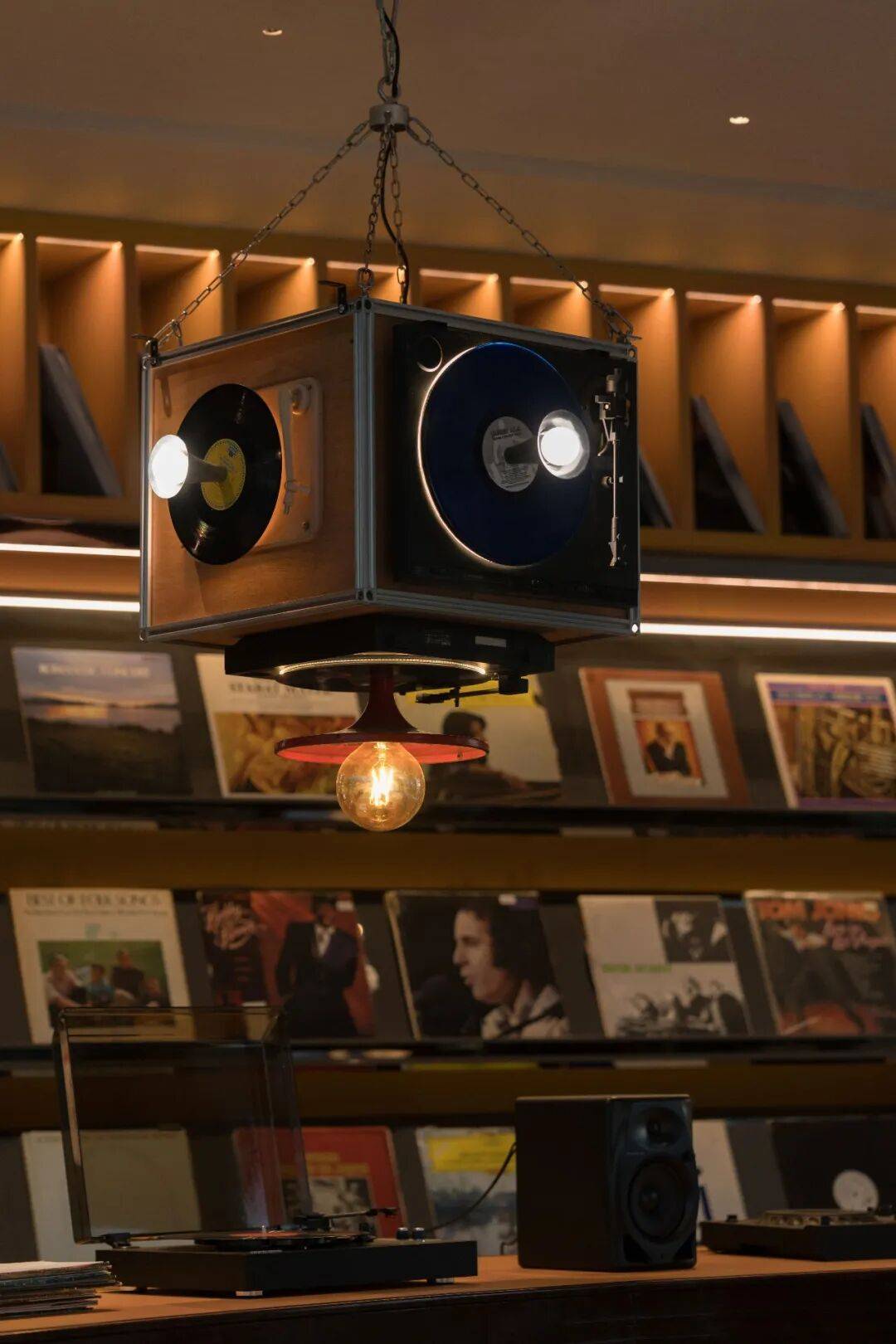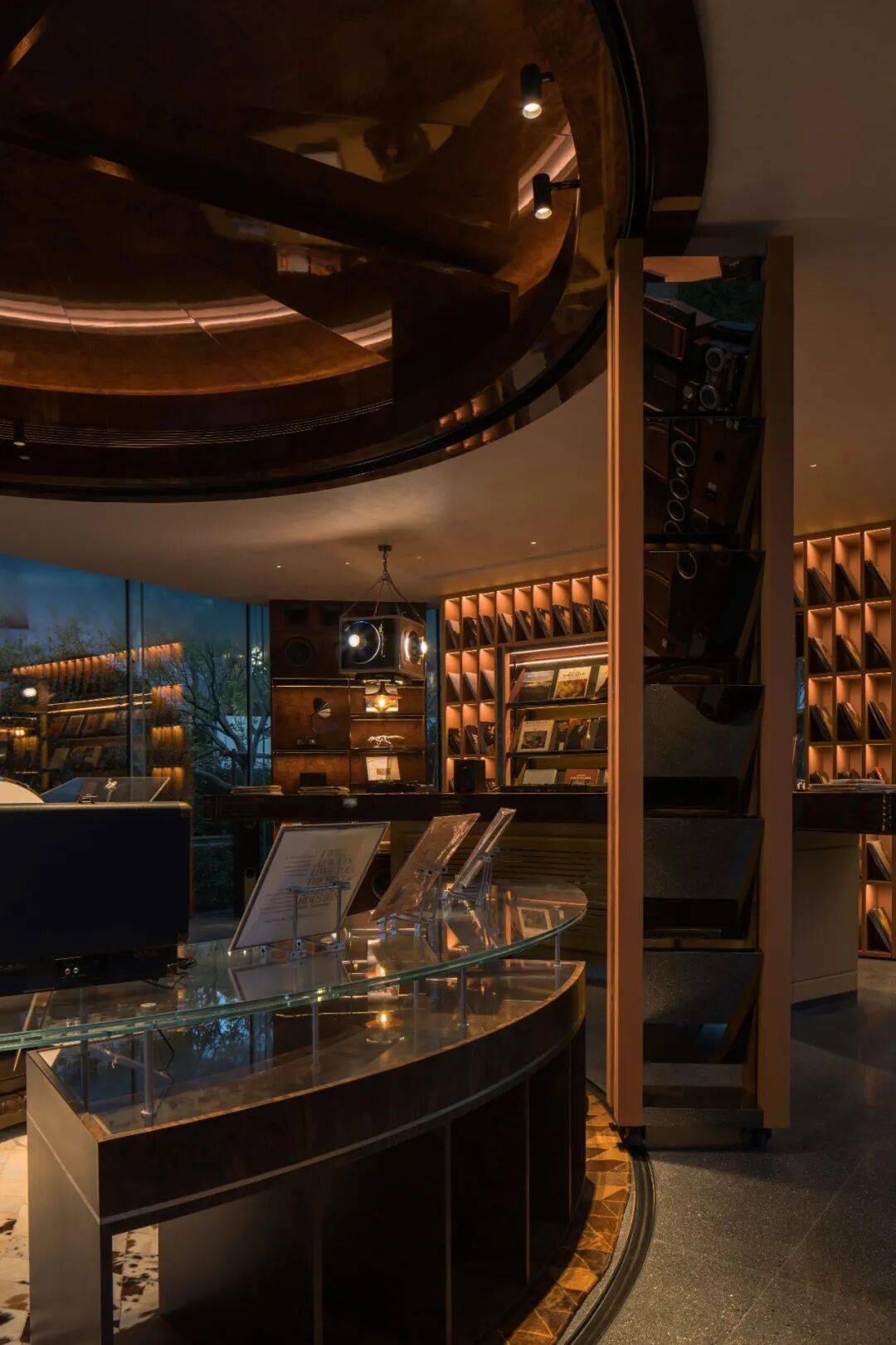 唱片店内,深色木质陈列架与弧形展墙构成稳定的展示界面,唱片在暖调光线中自然铺陈,营造沉浸而不张扬的聆听氛围。