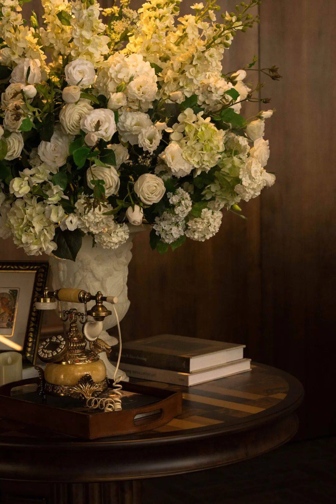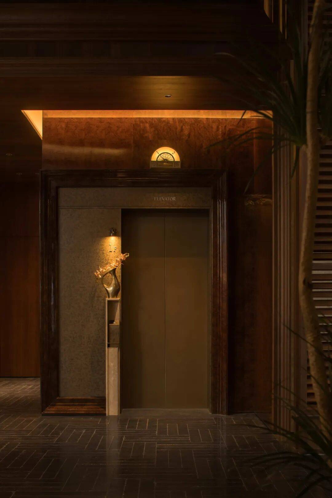 复古灵动形态的水晶吊灯悬于上方,剔透材质包裹着暖调光源,在营造仪式感的同时保持克制,延续古典与当代并置的空间基调。