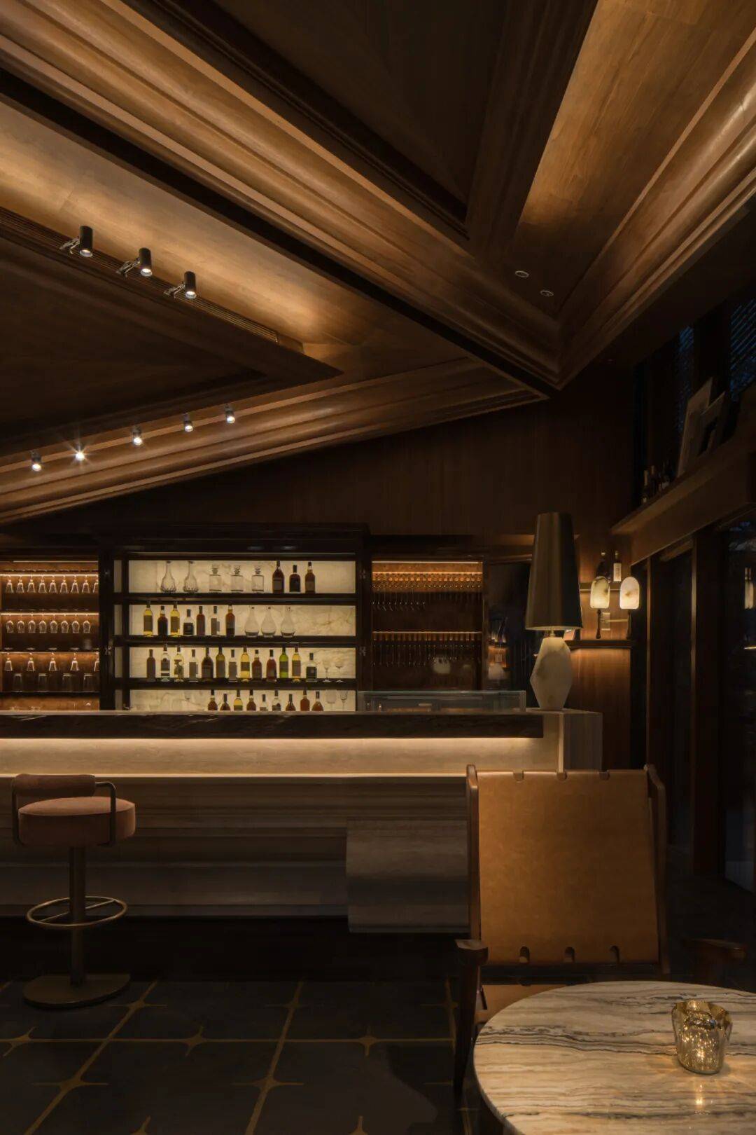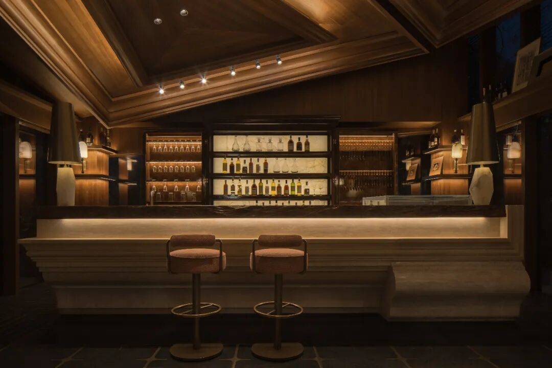 吧台区域以多重肌理石材拼贴台面回应传统工艺,嵌入式暖光与复古吊灯叠加出柔和光晕。
