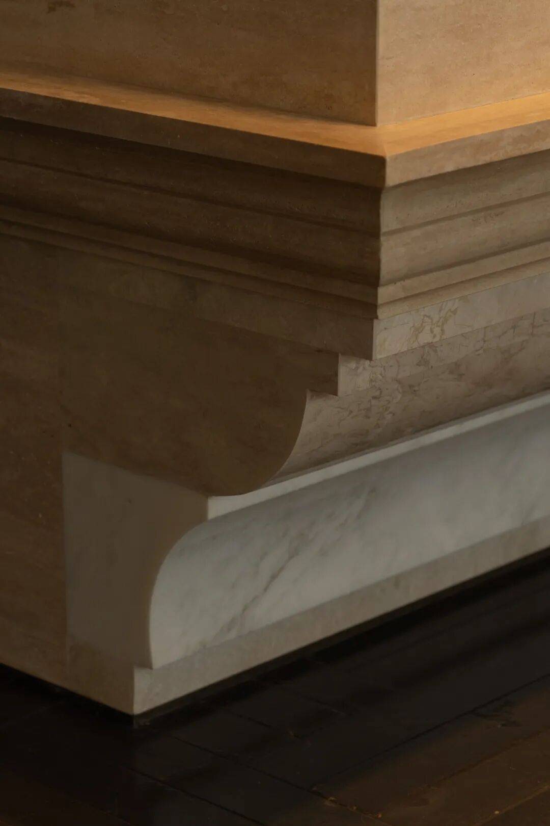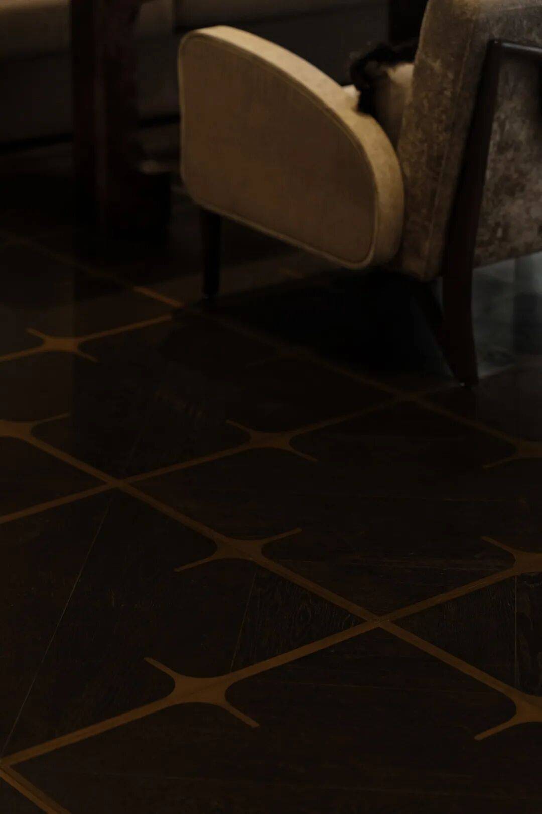 木质界面与暖调灯光构成稳定背景,错置的细节在克制中带来轻松感。吧台以多种石材拼贴,通过简化的几何切割,回应古典镶嵌工艺。墙面线条被重新组织,串联起酒柜、书架与垂直动线,让空间在秩序中保持流动。