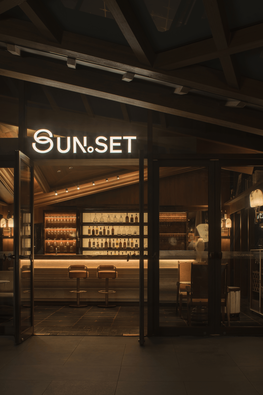 项目的入口,并未直接导向功能核心,而是先落在日茶夜酒这一日常场景之中。白天是茶叙,夜晚转为酒吧,空间以“双时态”的使用方式,成为城市与后续体验之间的自然过渡。