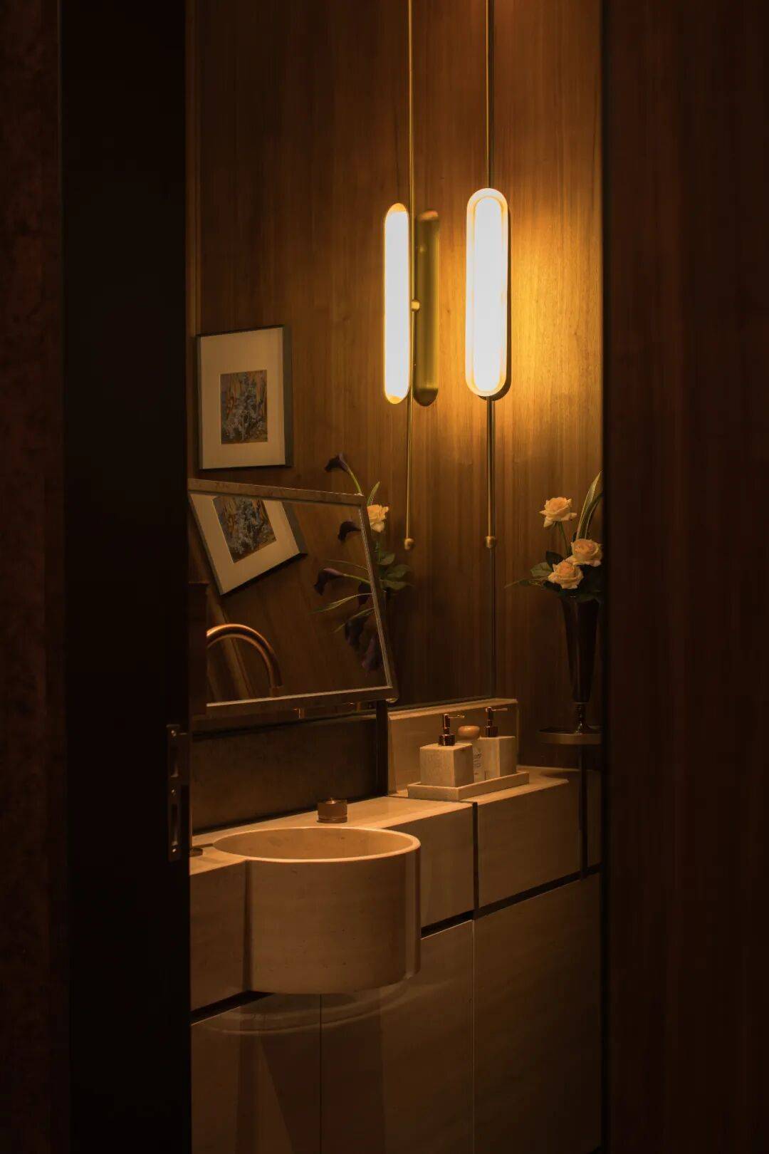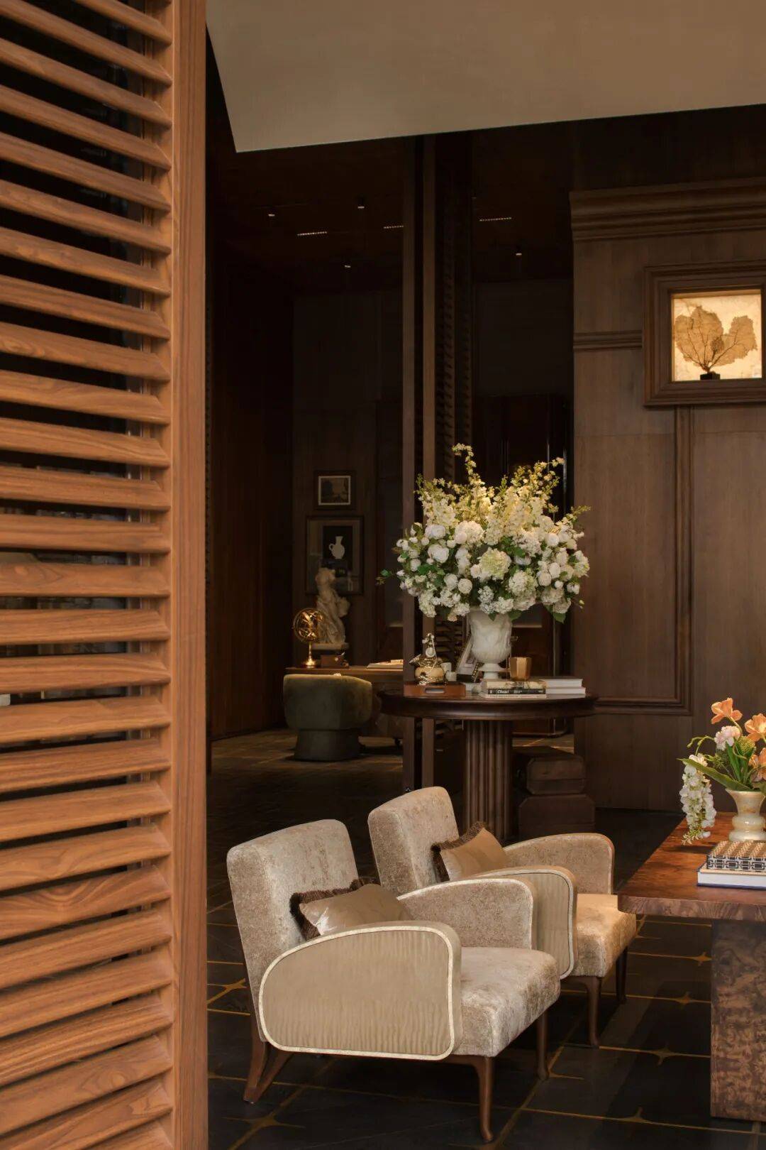 空间被组织为一处可被长时间占据的日常场域。温润的木质、哑光金属与肌理石材构成稳定基底,简化后的古典语汇被嵌入当代结构之中,在秩序与松弛之间取得平衡。