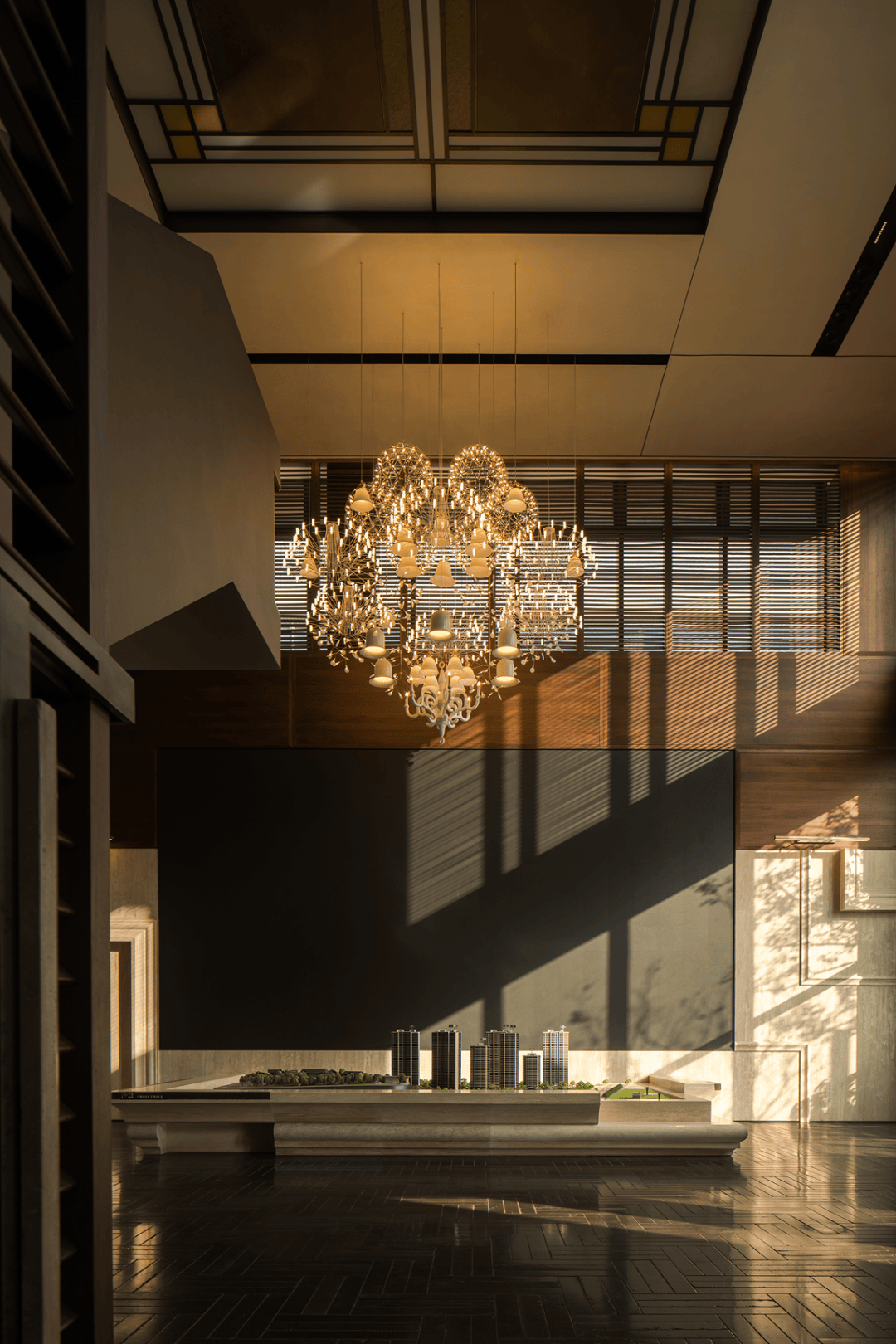 主材:木质、哑光金属、肌理石材、复古吊灯、水晶灯。