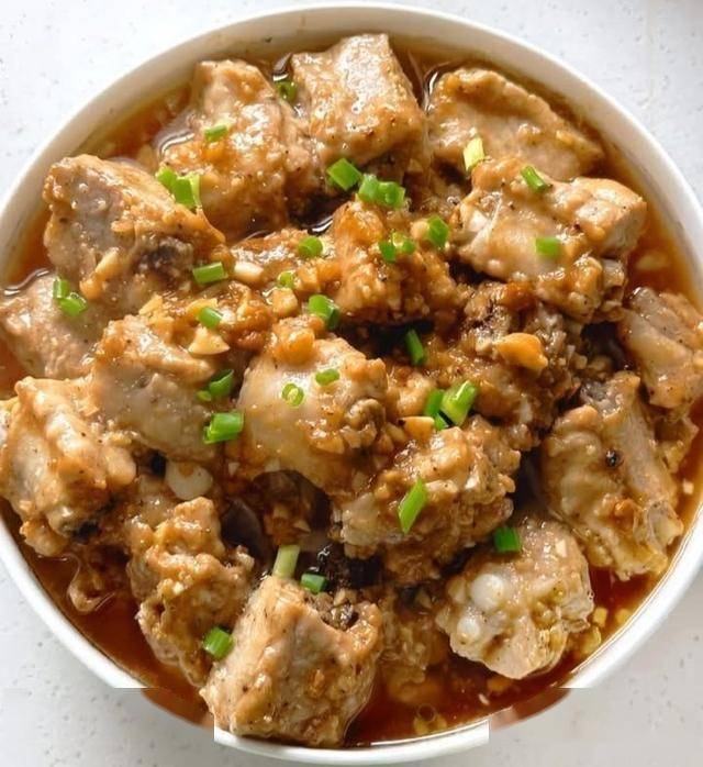 3. 取出排骨,随后撒上剩余蒜末和葱花,淋入15毫升食用油提香,拌匀即可食用。
