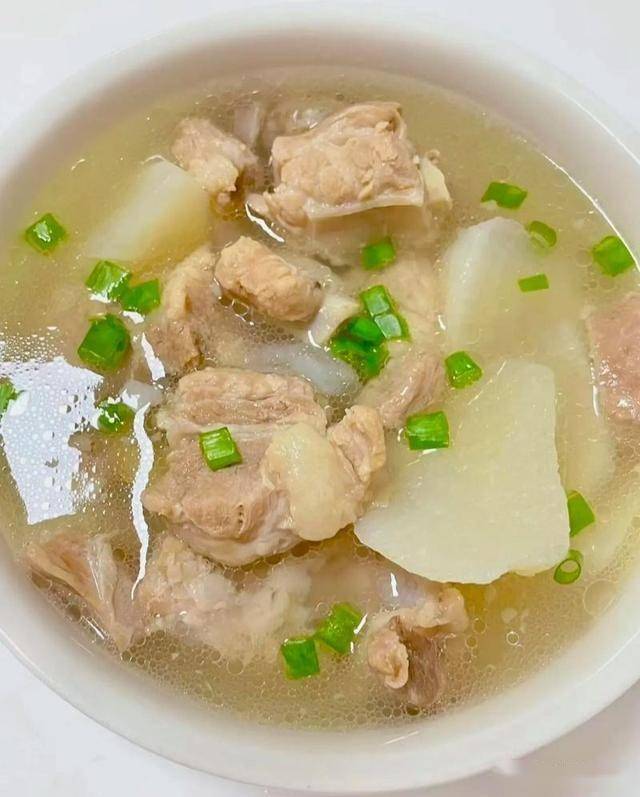 4、放入白萝卜块,保持小火再炖20分钟,至萝卜通透变软,加少许盐调味,出锅前撒一把葱花增香即可。