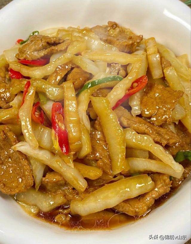 1. 白菜帮切条;油热下入肉条,炒出油脂。