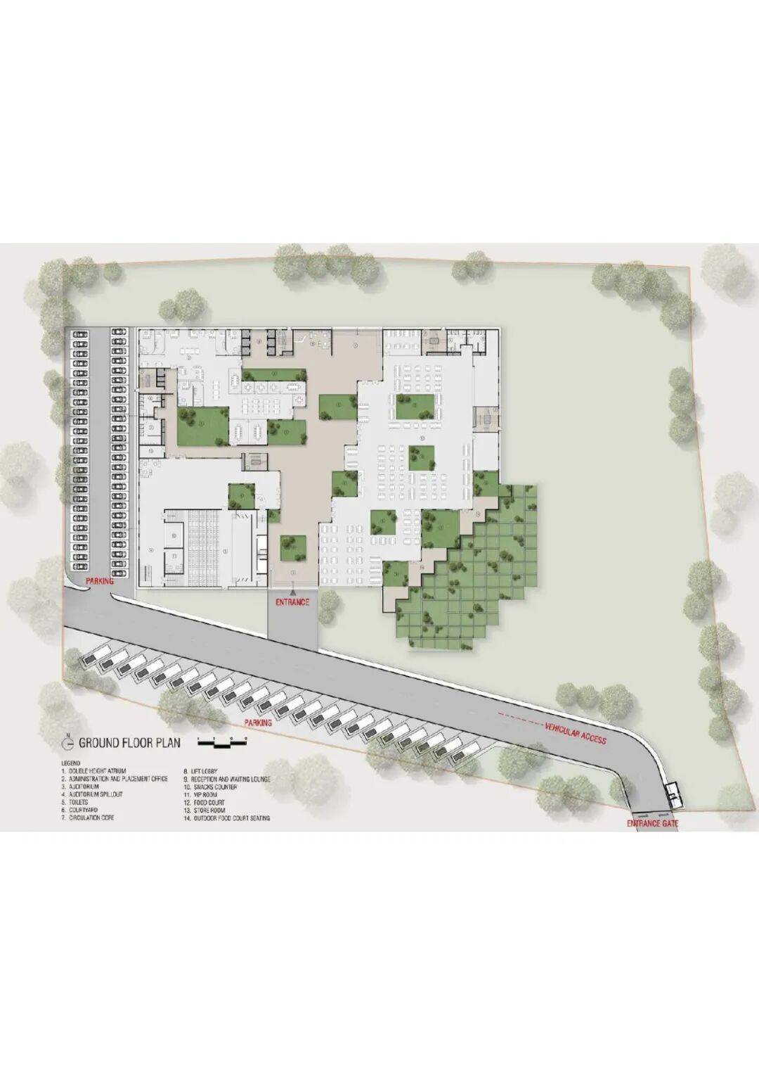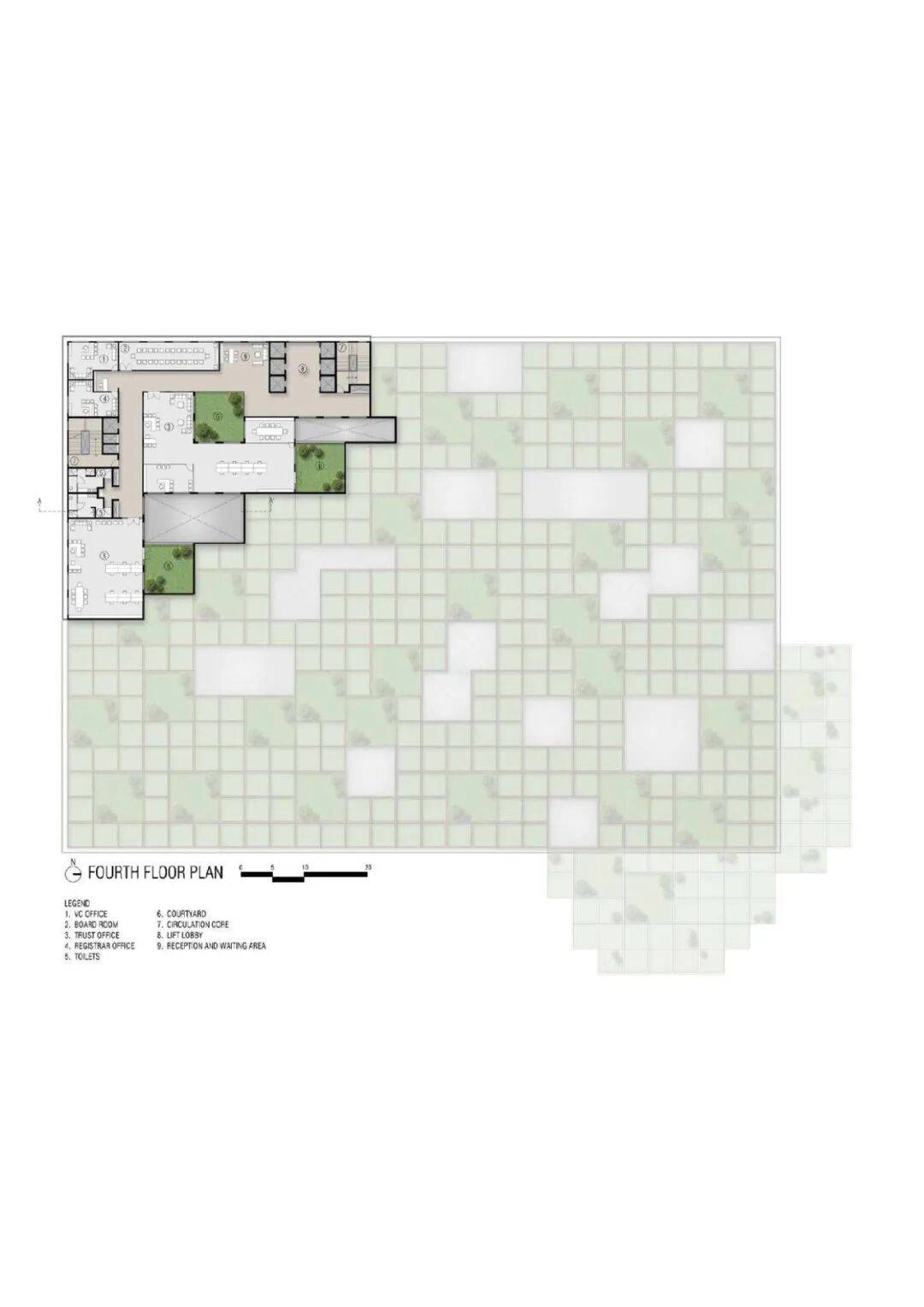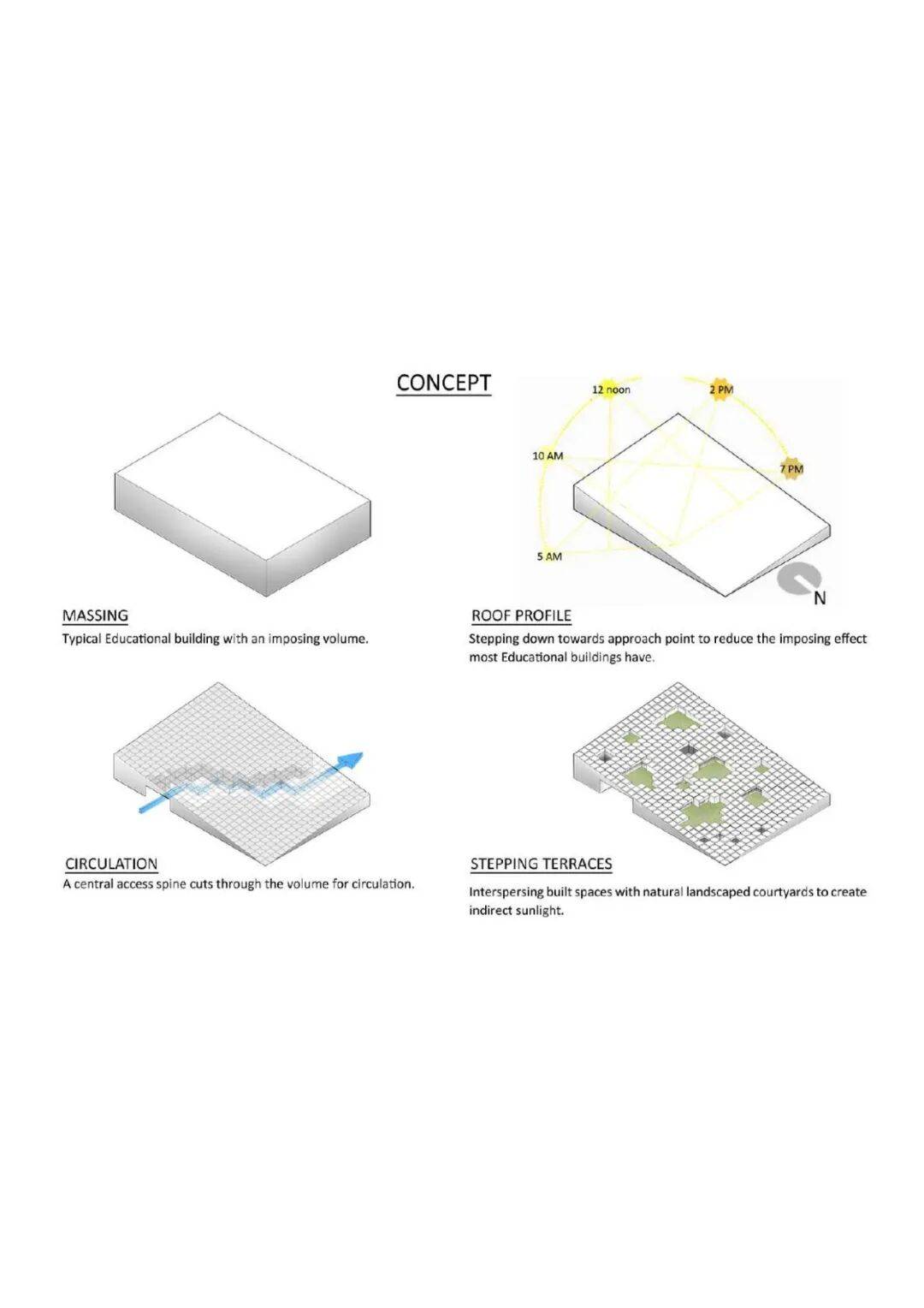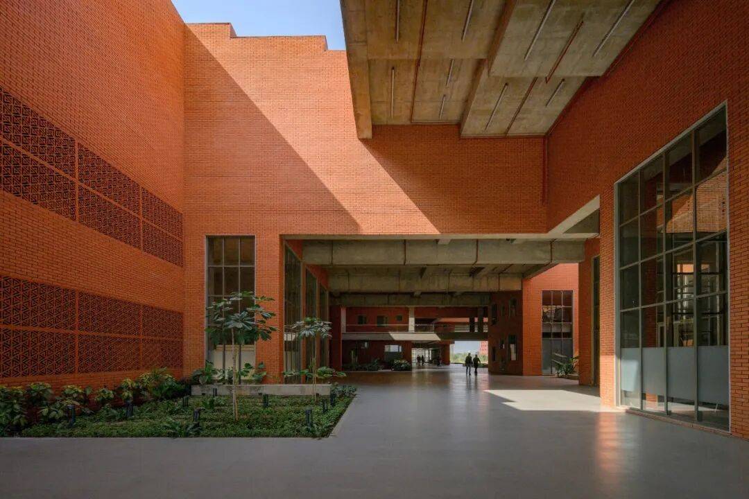 自然通风与采光:通过多个景观庭院引入自然采光,北向采光和庭院布局借鉴印度传统建筑策略,使间接光线深入建筑内部,同时形成自然通风路径。对角线室内街道连接庭院与公共空间,加强空气流动。