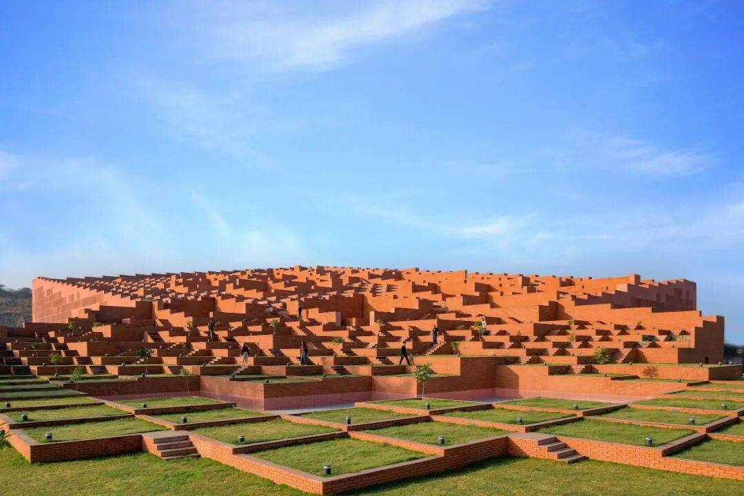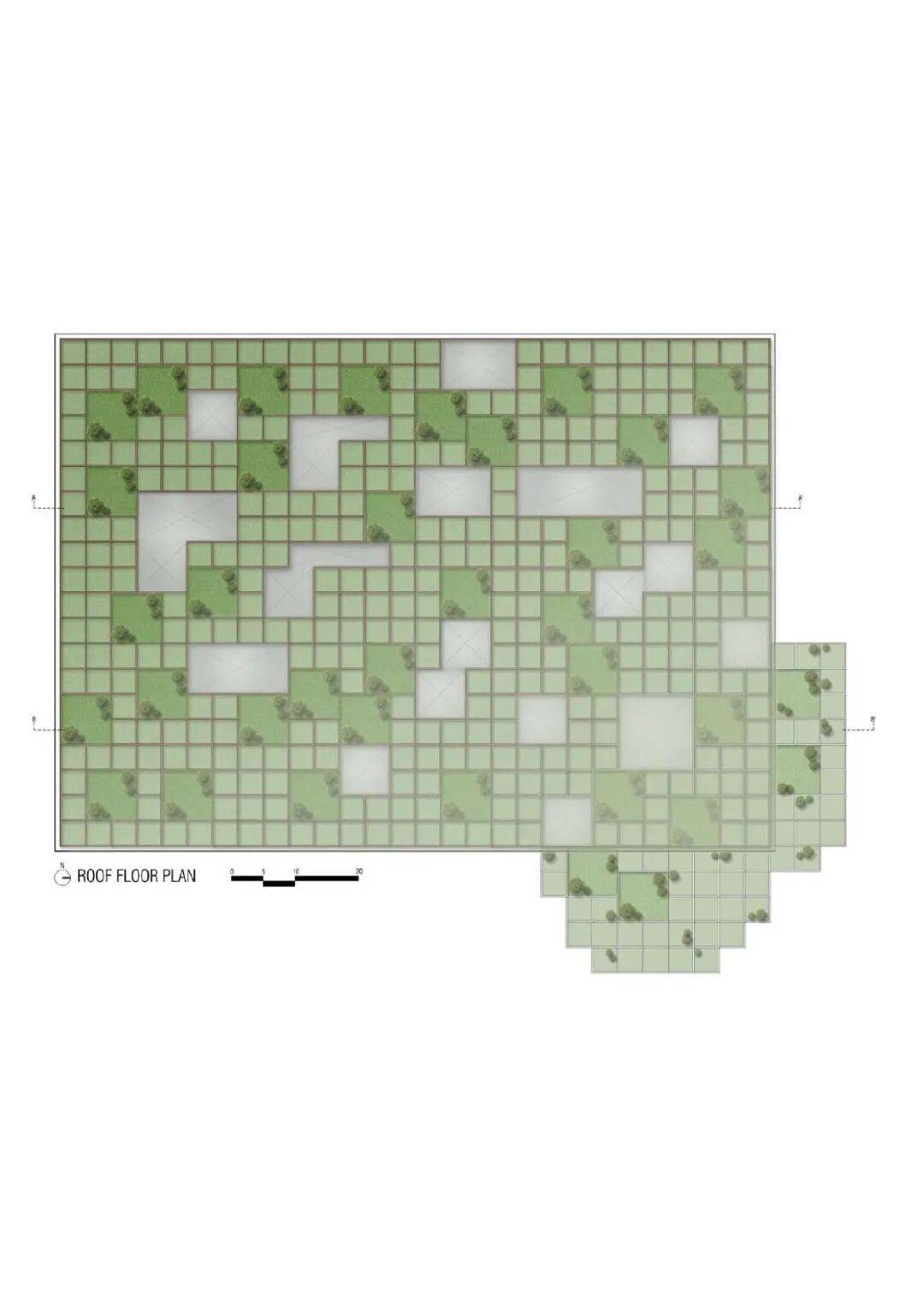 退台式屋顶空间:建筑沿对角线逐层退台,形成五层连续平台体系,共463级阶梯平台,总面积约9000平方米。屋顶作为可使用的公共空间,借鉴印度1100年历史的阶梯井(Stepwell)空间原型,将蓄水与公共活动功能结合,延续传统社区交流的空间逻辑。