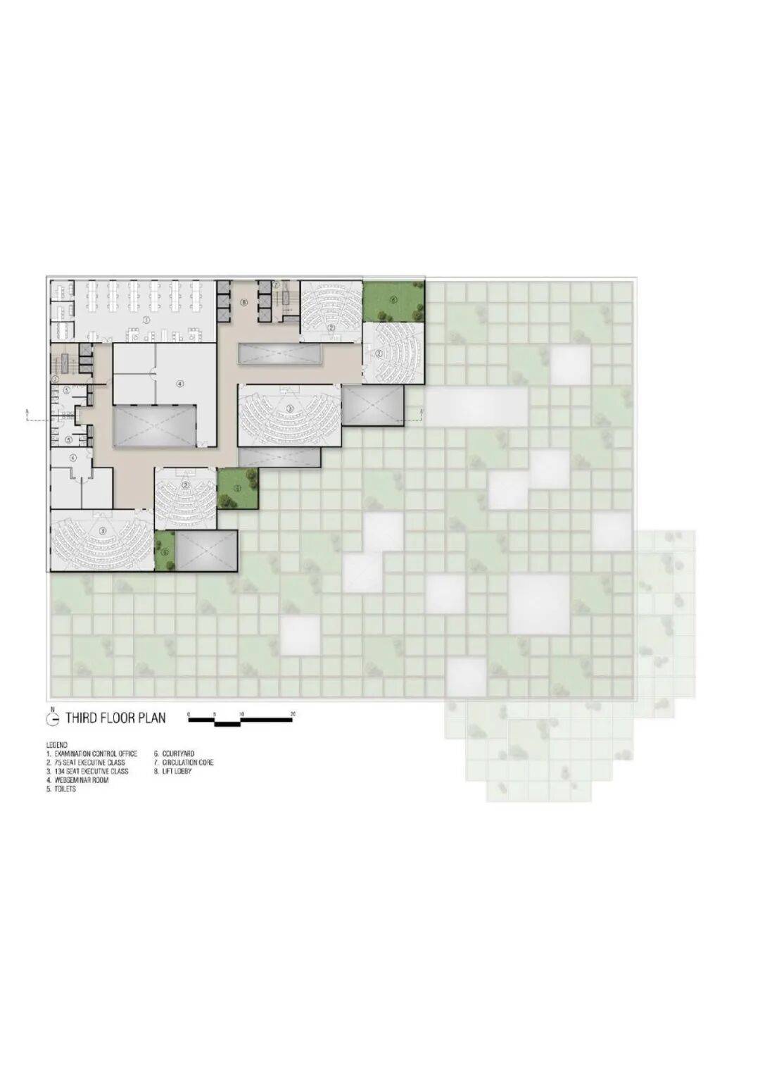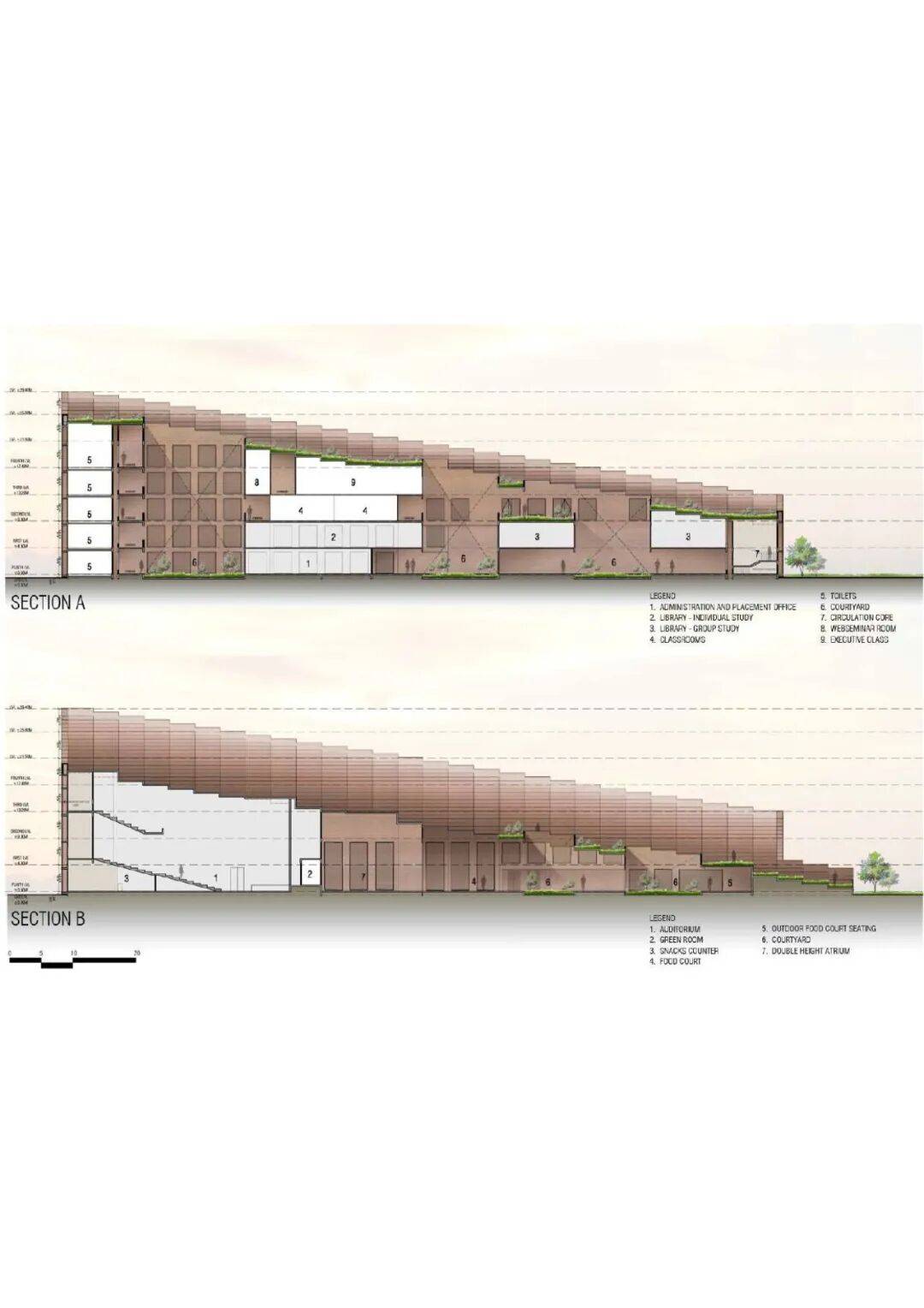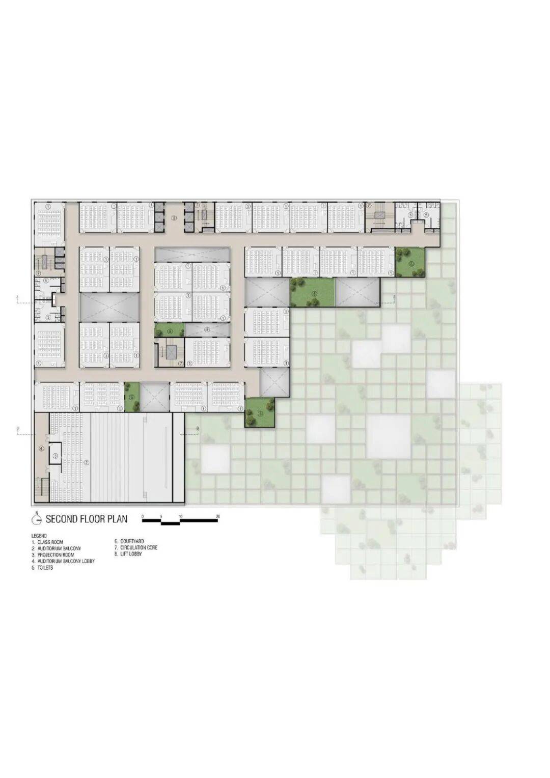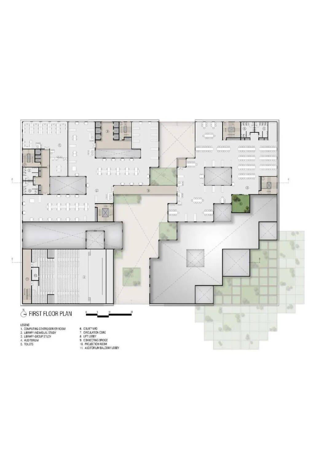 功能整合:建筑整合行政办公、礼堂、研讨厅、图书馆及餐饮等功能,通过垂直布局实现功能分区。首层为餐饮区、礼堂与行政接待;二层为图书馆;三层为公共教室;四层为阶梯教室;五层为行政办公区。