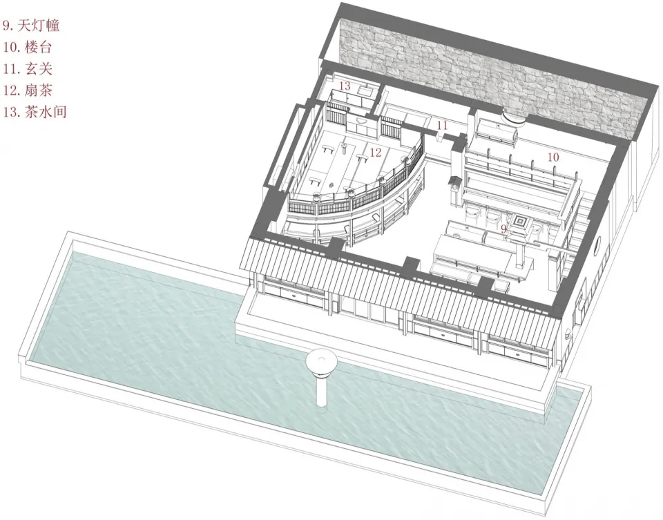 半壁视野与雅集图:借鉴南宋“马夏半角”画法,构建半壁楼台与折尺登山路径,通过不全的视野激发对隐藏体量的想象。植入《西园雅集图》的构造,以雅集场景实现“空景”的叙事,形成“人去楼空”的追念之景。