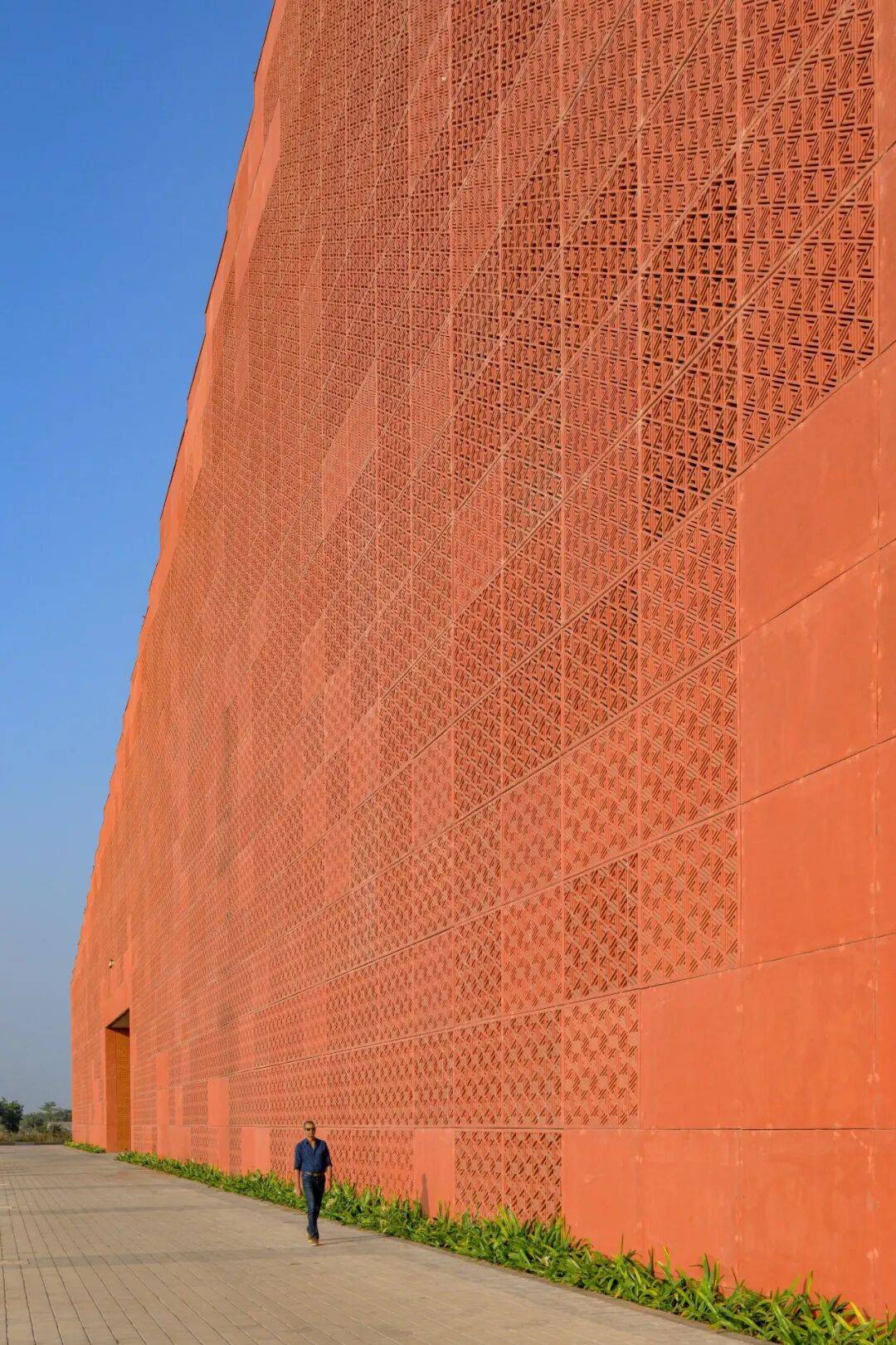 遮阳系统:东、西及南侧采用通风式GFRC遮阳构件,减少太阳辐射并降低热量吸收,适应印多尔地区高温气候(年约八个月气温在30–40°C之间)。