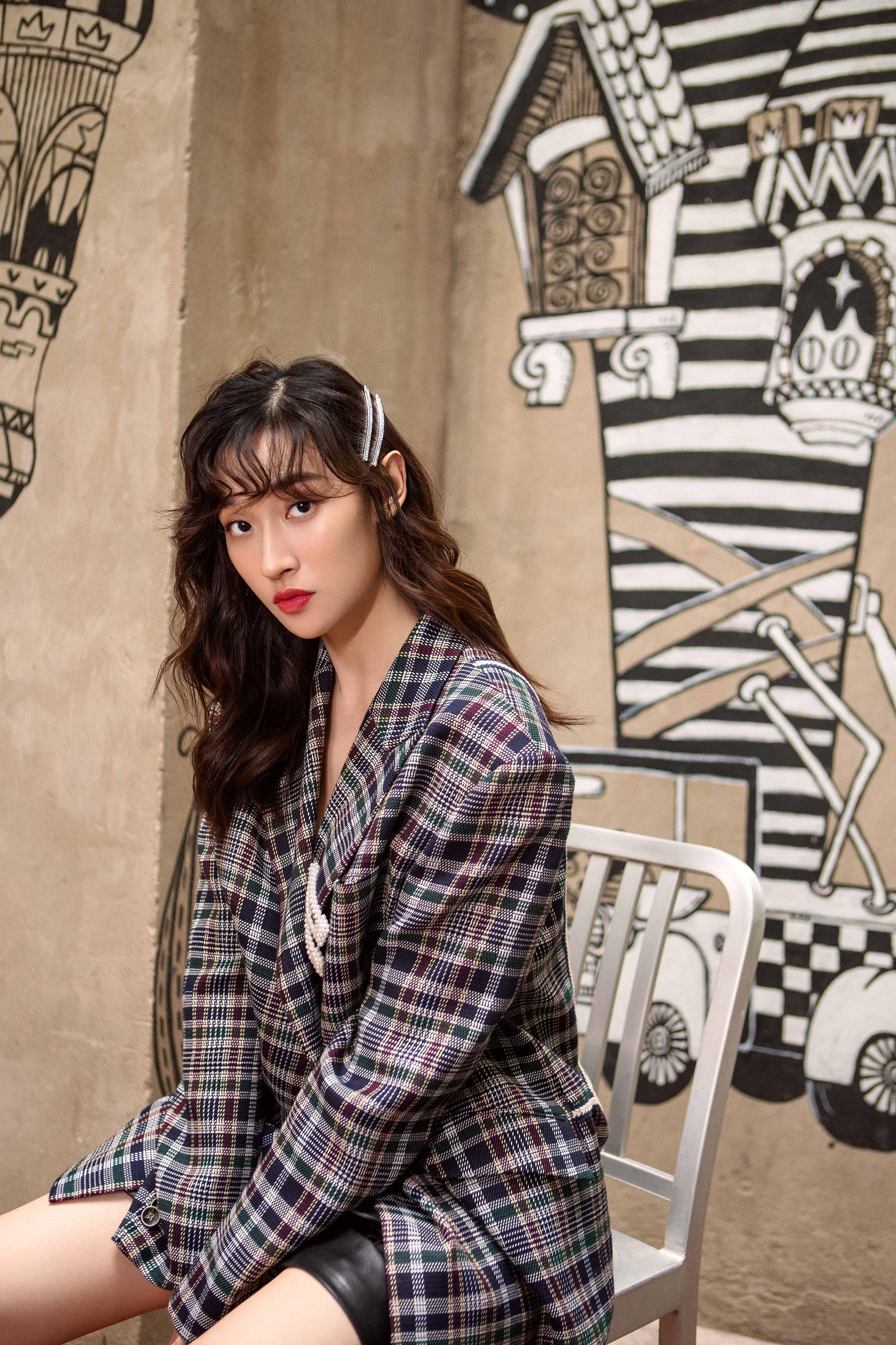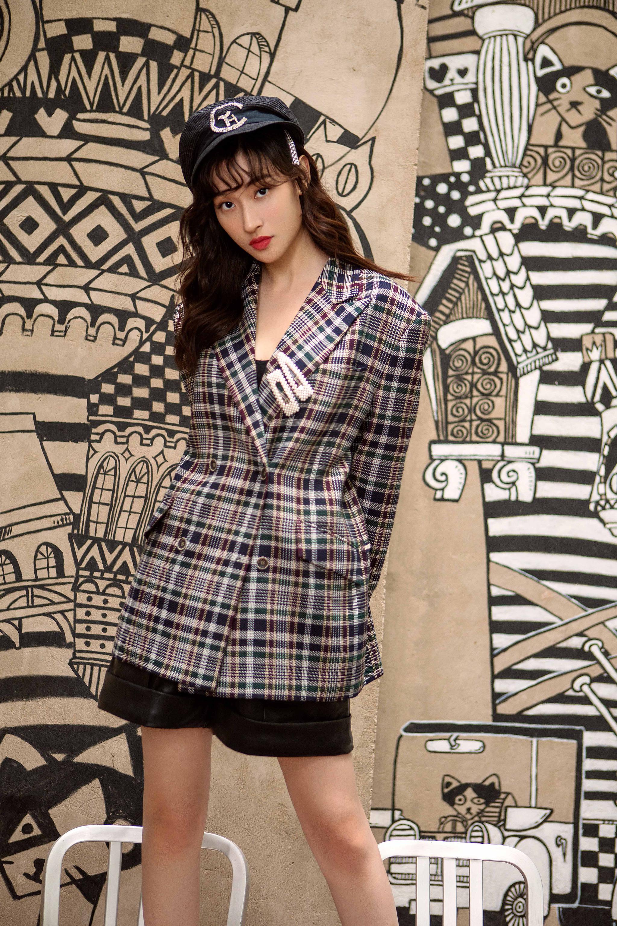 格子小西装和短裤秀出纤细长腿。