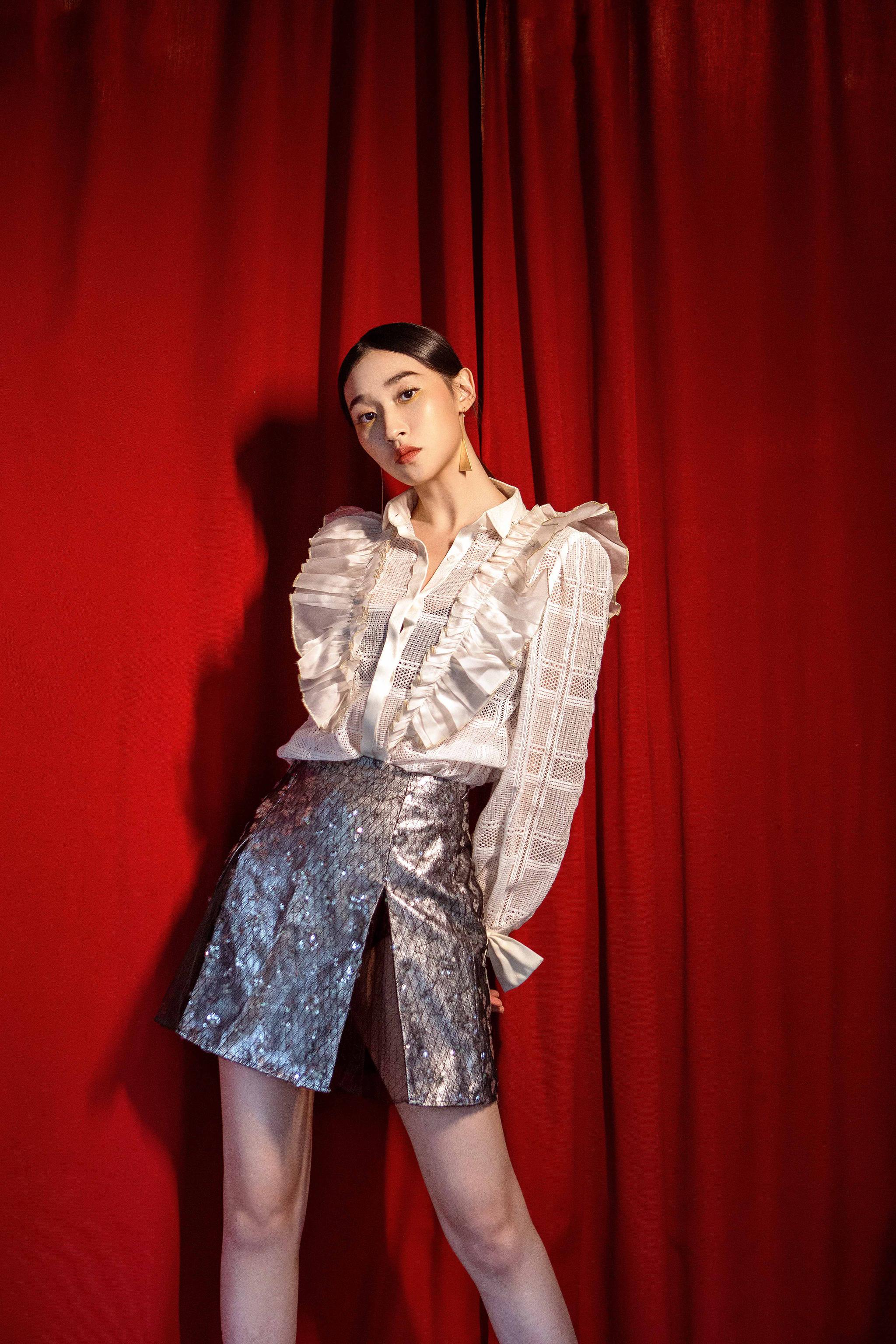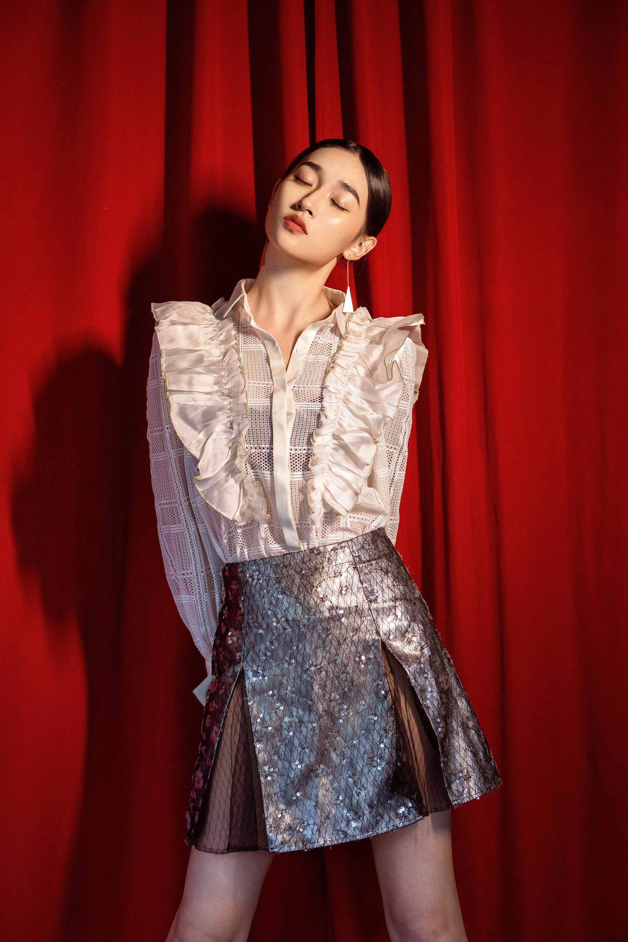 张馨比时尚look曝光,白色花边衬衣和高开叉亮片裙尽显都市摩登范儿