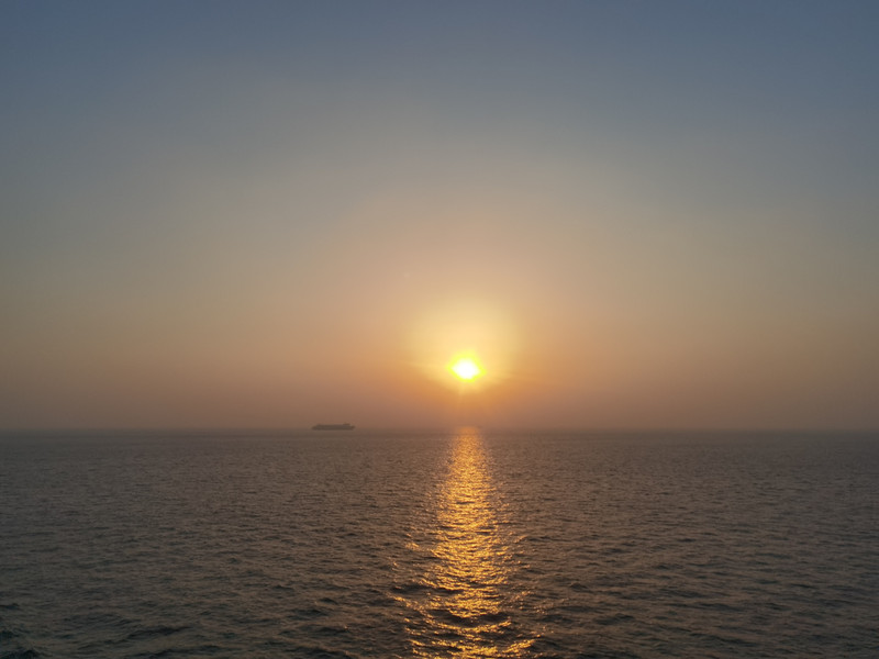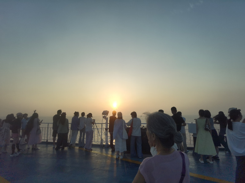 卤蛋真不好吃,咬一口吐了,油浸金枪鱼太沺,一小盒也没吃完。 5点45,出来看日落。甲板面朝太阳的那边站满了人。虽然在青岛海边看日出日落已习以为常,但在海上看日落还没有过,所以,只要人群有合适的地方,就要挤进去拍两张。