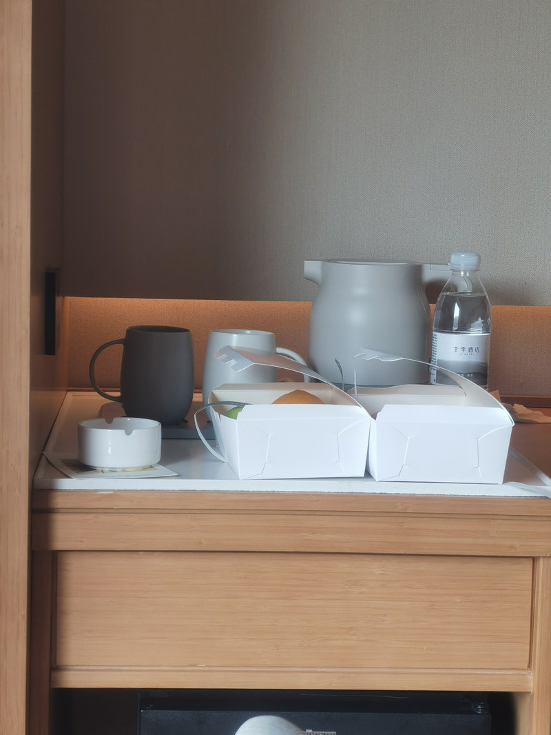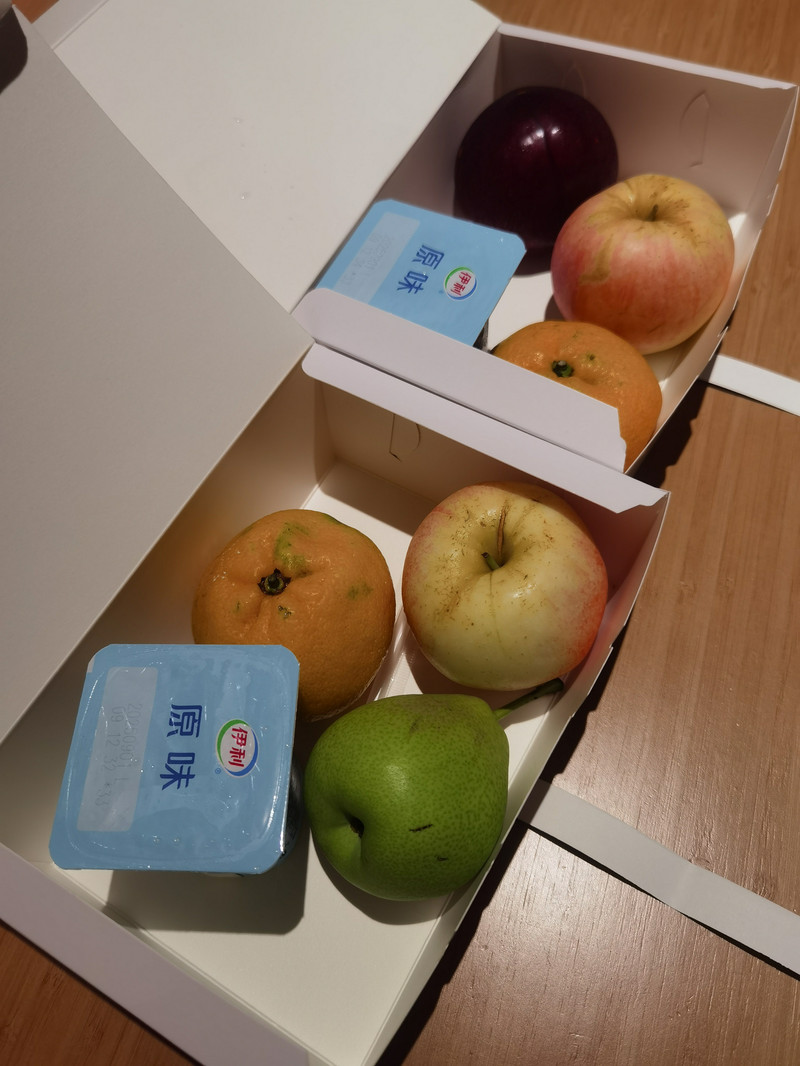 回到酒店,前台说很抱歉今天没经过我们同意就调整了房间,给我们拿了两盒水果......