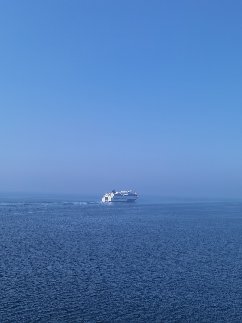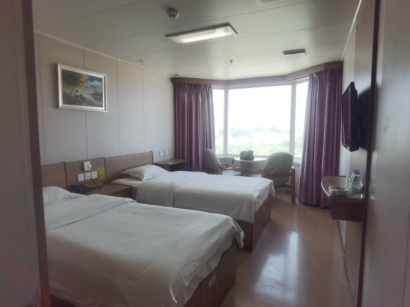 我们这个房间是在船的尾部,走几步就到甲板了,还挺方便,就是路过人多,有点吵。 1:15开船,晚了几分钟,还是很准时的。 我们这艘船的前面还有一个渡轮,估计是开往其他方向的。繁忙的港口