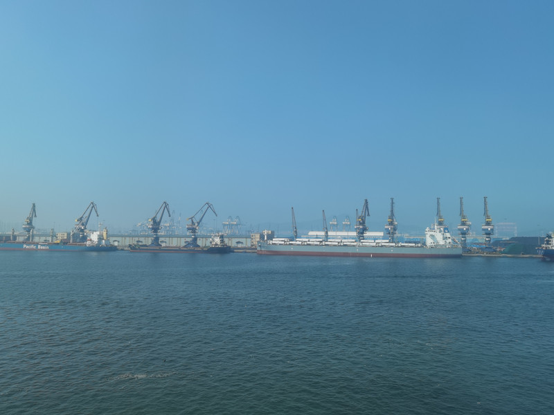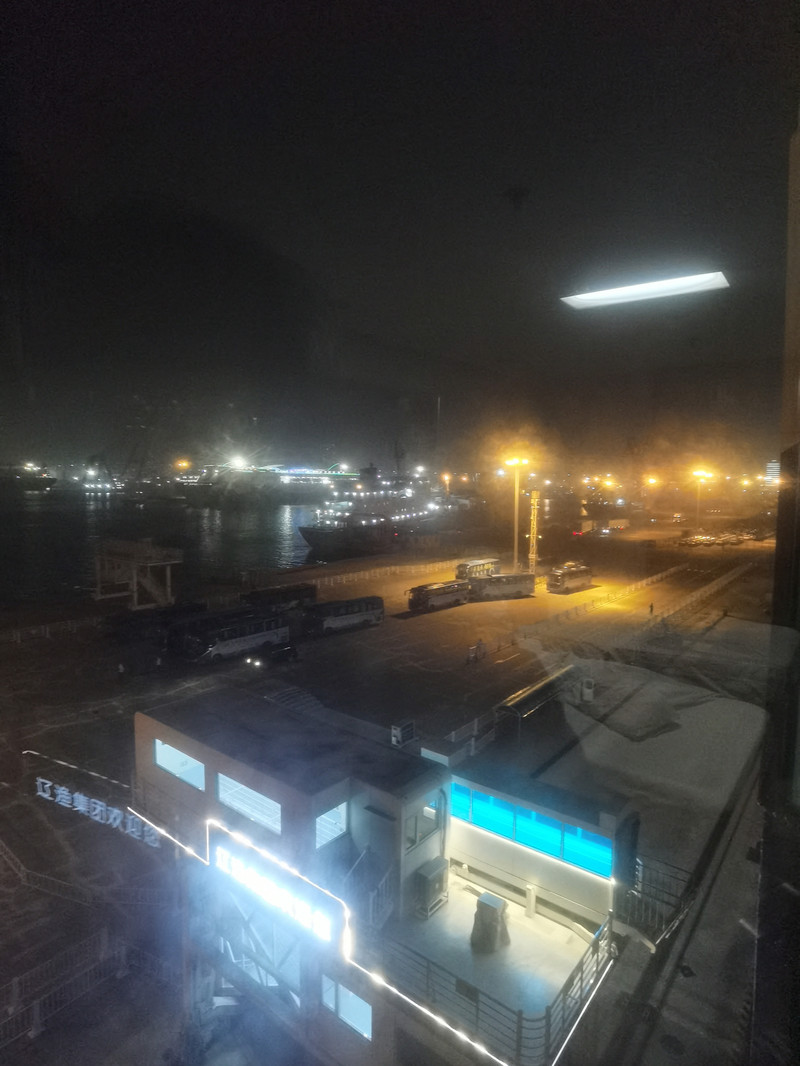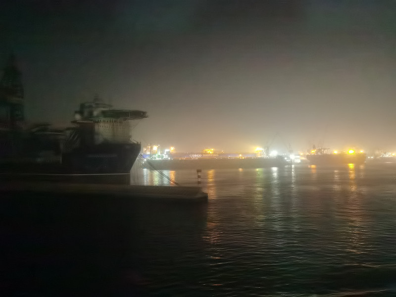 手机信号一会儿有一会儿无,我偶尔会接到几条微信,但图片打不开。备忘录可以输入文字,不能语音输入。 6:45,外面全黑了,网络也正常起来。还有一个小时就要到了,在海上失联了几个小时,想念陆地了。 7:24进港了