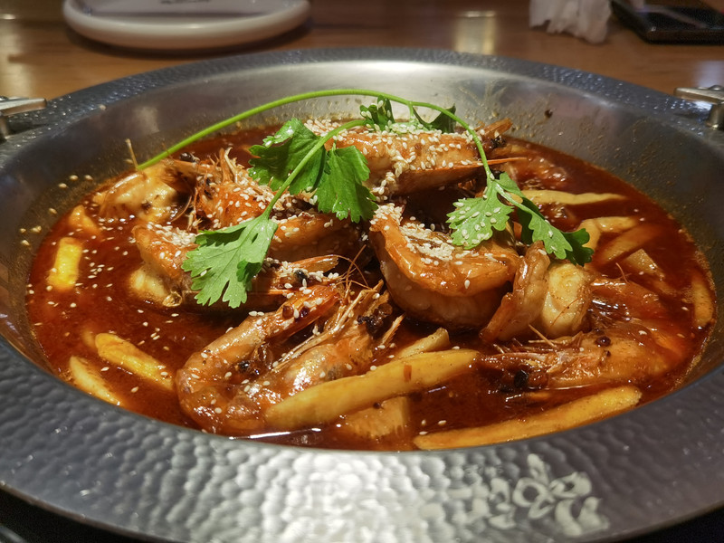 我们放好行李,下来找餐厅晚餐。酒店旁边一个专做大虾的餐厅吃饭,晚上吃不太多,要了一个小份大虾,饮料和米饭都是自助。菜的味道一般,最后总价108的餐费,在某评上买了券,最后只花了47元,还不错。