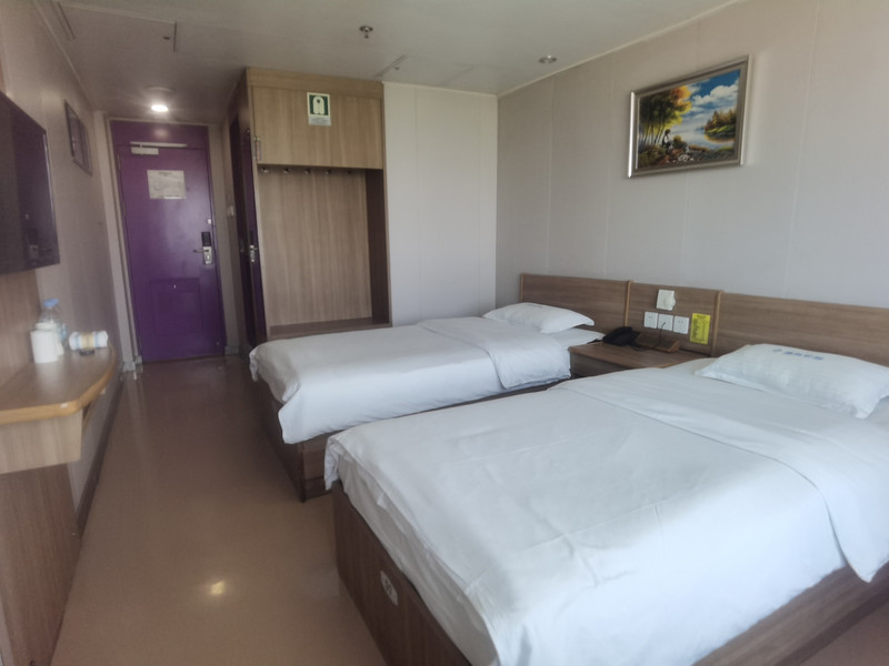 登上窄小的入口,一位工作人员举着喇叭不断问游客几号舱,我是二等A,他就说二等舱是在9楼,然后我们左转等电梯。