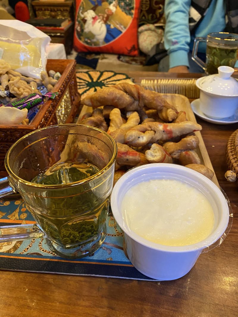 期间,寺庙一位老者很热情,还给了藏区特有的一种饼给我吃,可惜没有拍照,不过我猜应该是藏族人民比较普遍的小食。贡嘎县比较小,除了热麦寺,没有其他可逛的了,于是准备返回拉萨机场,到机场转机场大巴前往拉萨市区,在机场大巴上面订了民宿,因为不是旺季,很多民宿可以预定。大巴抵达市区时还下起了雪,不过隔着窗户,没有拍照。 我订的是拉萨东区的一棵树客栈,刚到民宿,英姐(客栈老板)就泡茶给我喝,刚好遇到英姐的一位好友从那曲过来看她,也尝了这位朋友带过来的西藏酸奶。