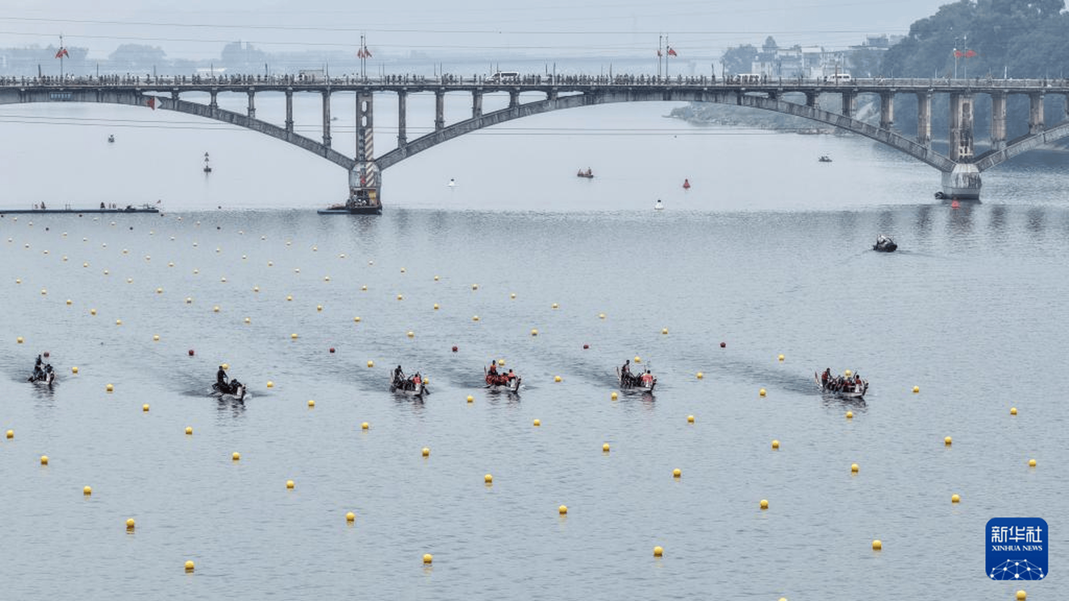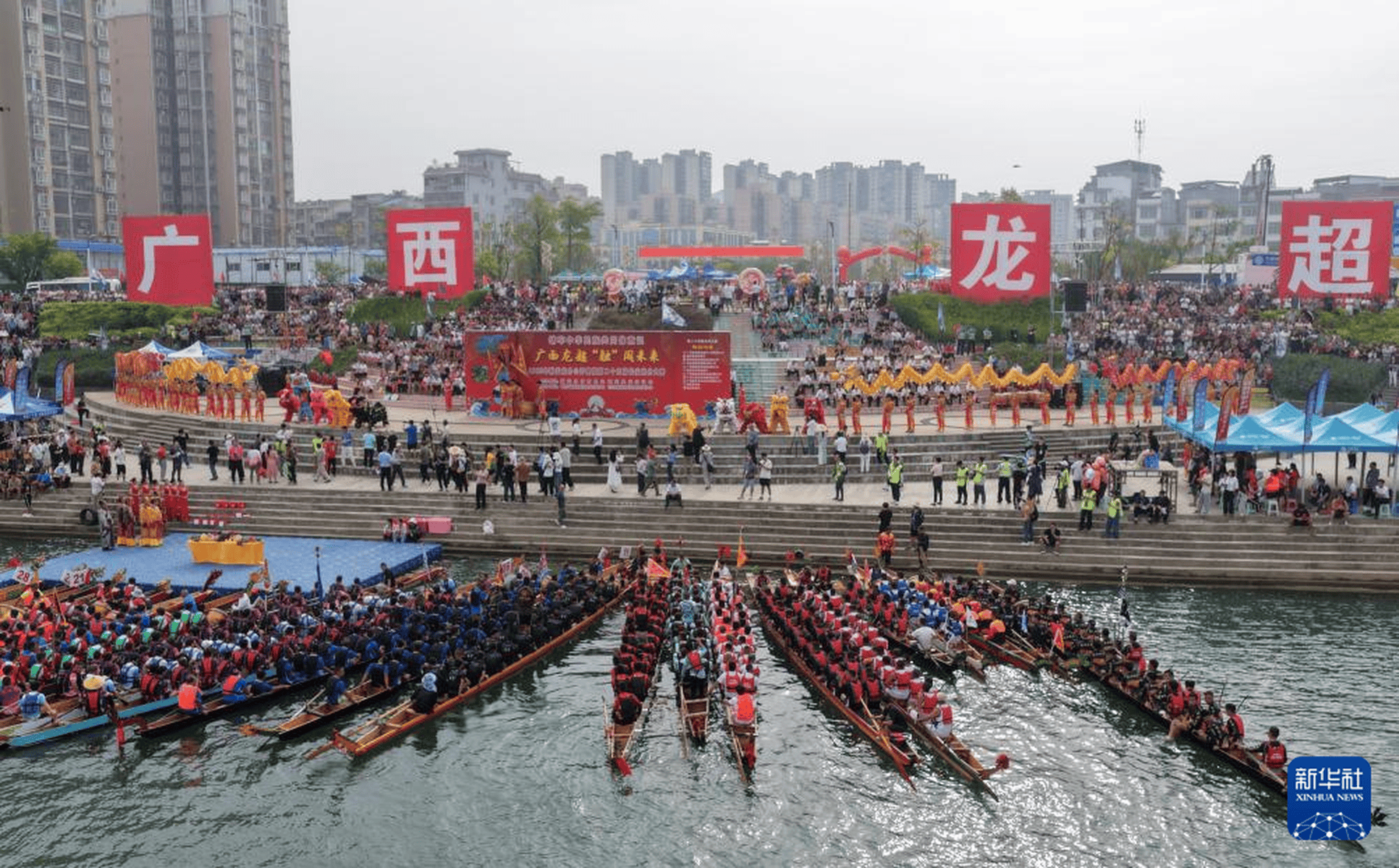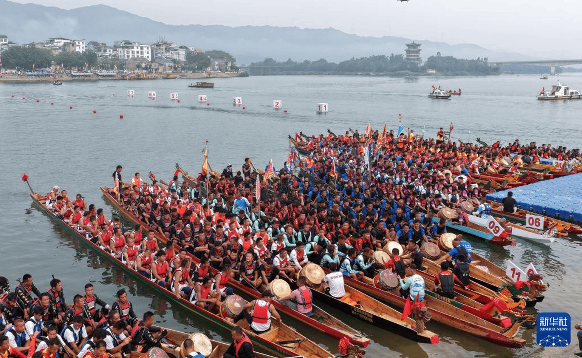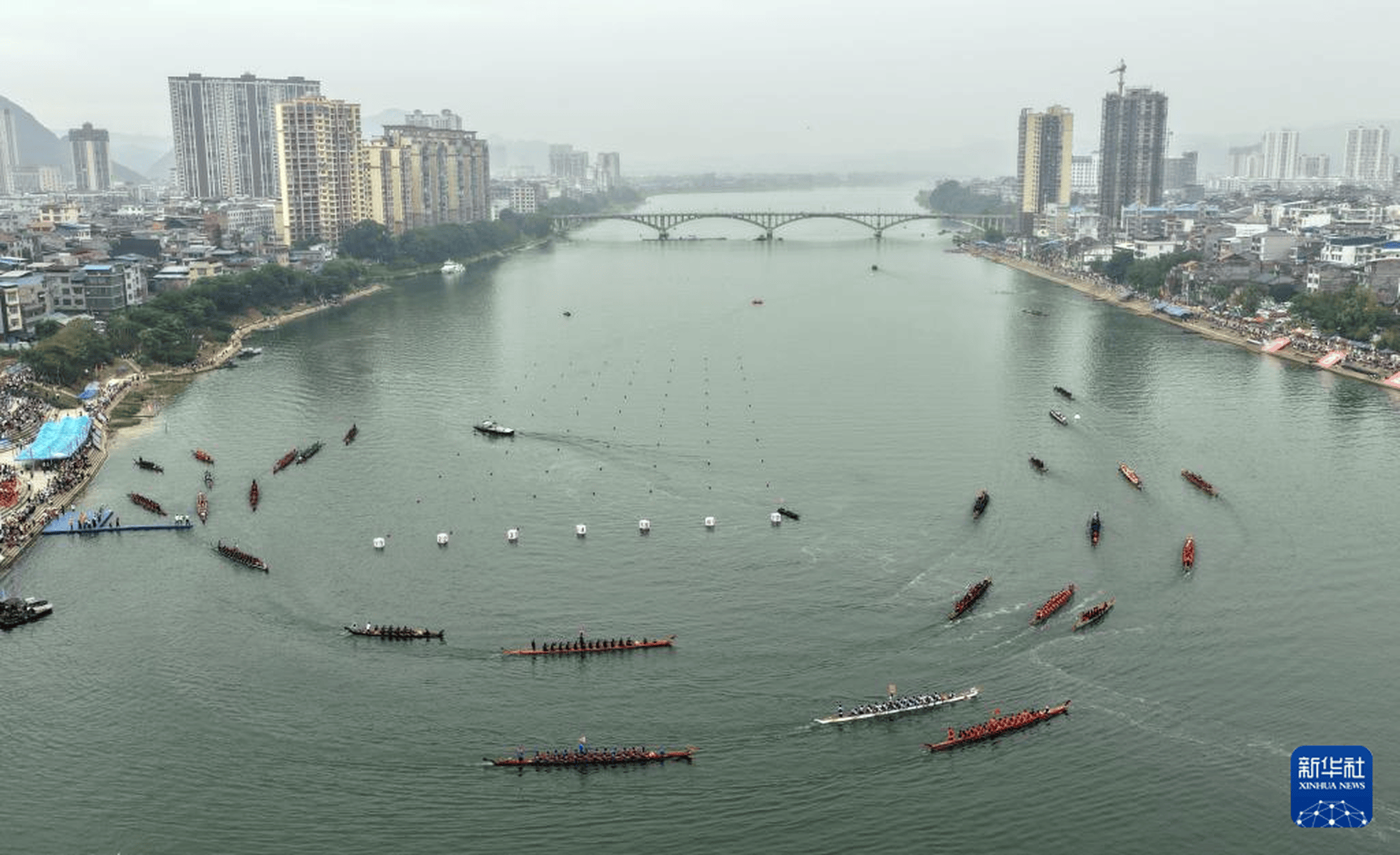 9月30日,在广西柳州市融安县迎国庆龙舟大赛中,参赛队伍在融江河上集合,准备比赛(无人机照片)。新华社记者 黄孝邦 摄
