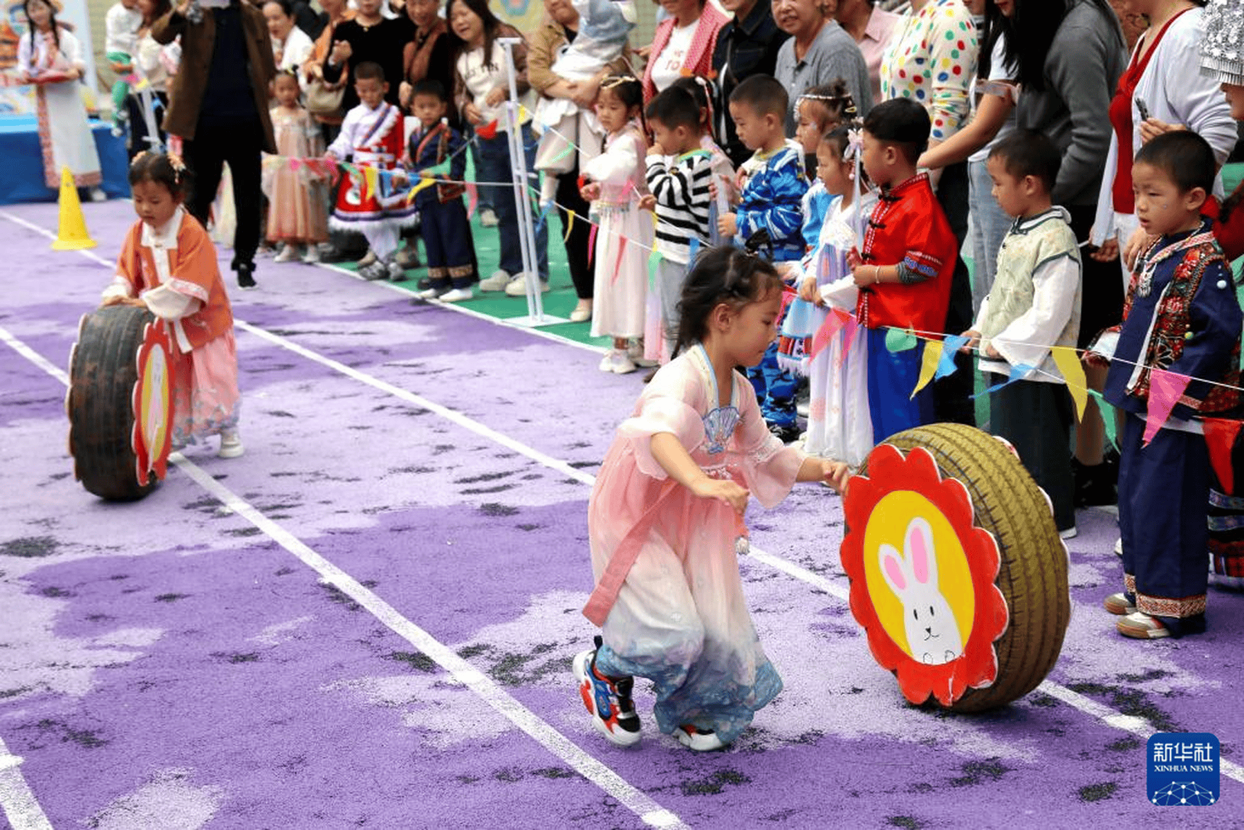 9月30日,湖北省十堰市郧阳区金色摇篮幼儿园孩子们参加“滚月饼”比赛。随着国庆、中秋的临近,各地群众开展丰富多彩的活动,喜迎“双节”。新华社发(曹忠宏摄)