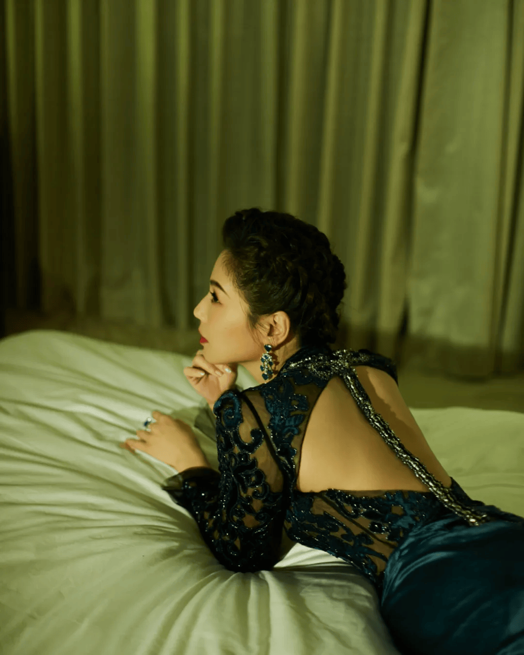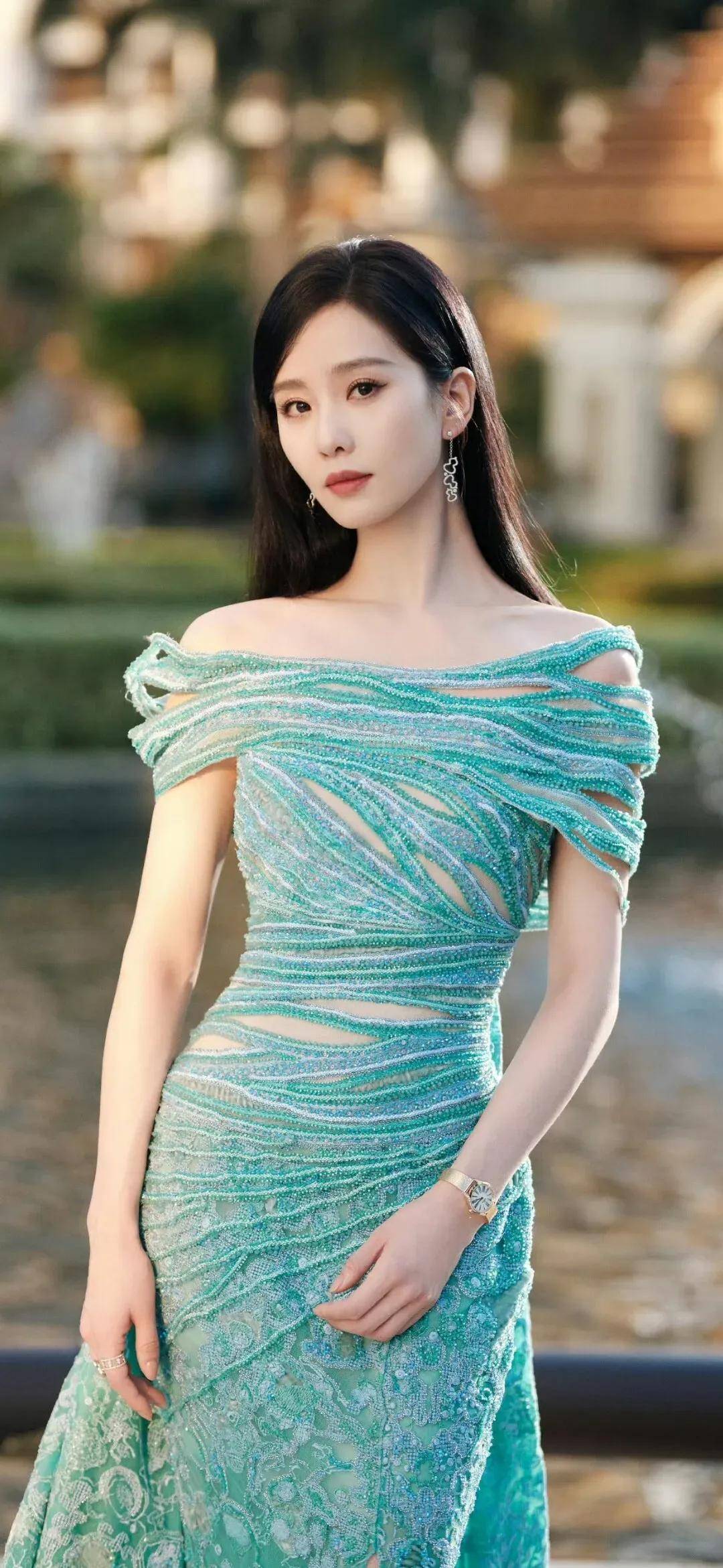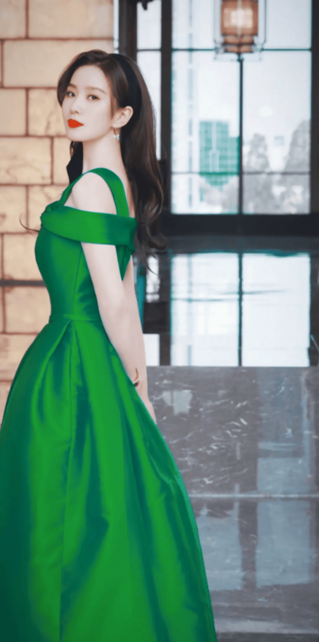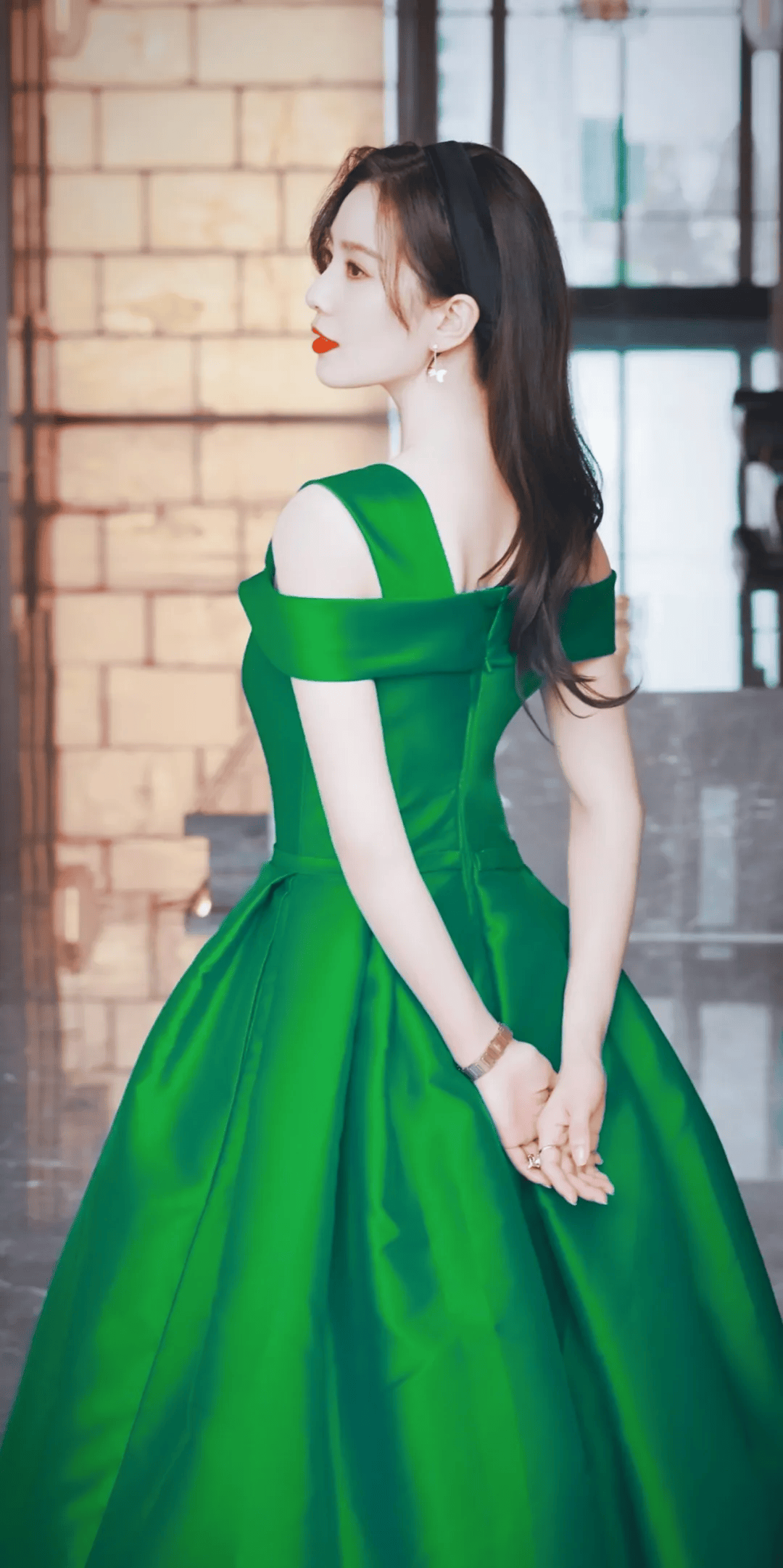 绿色本就带有宁静和疗愈的气质,而当这种色彩与礼服的精致剪裁相遇时,瞬间让整个人的气场提升了好几个层次。搭配上她特有的淡雅气质,整套造型既不张扬,却又令人过目难忘,仿佛一幅清冷高贵的画卷缓缓展开。