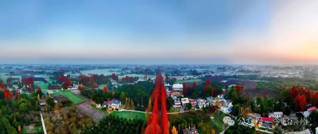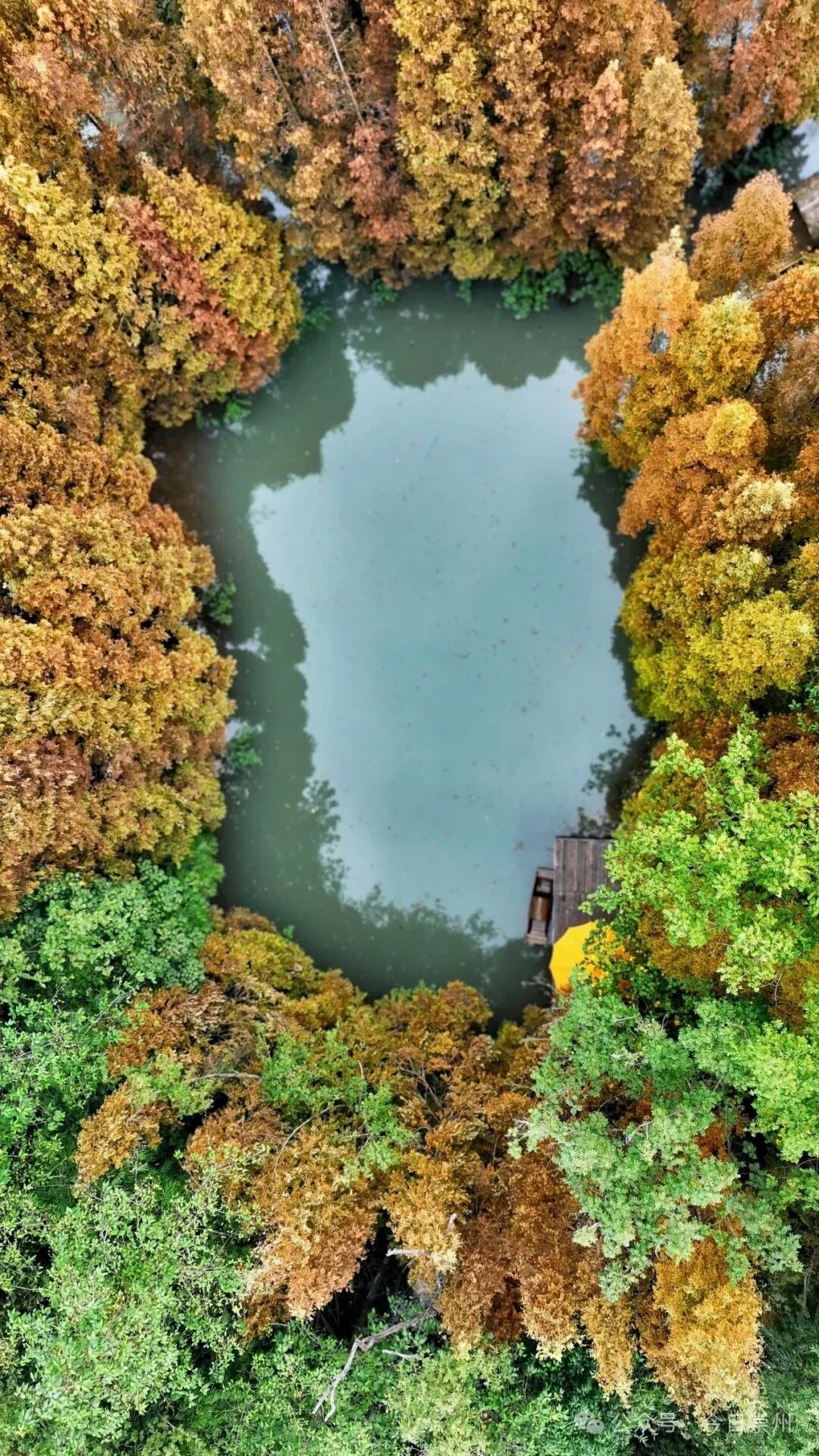 桤木河湿地水域面积约2100亩 绿化率高达79% 这个时节彩林绚烂 步行栈道穿梭林间 观景台上可观鸟赏水