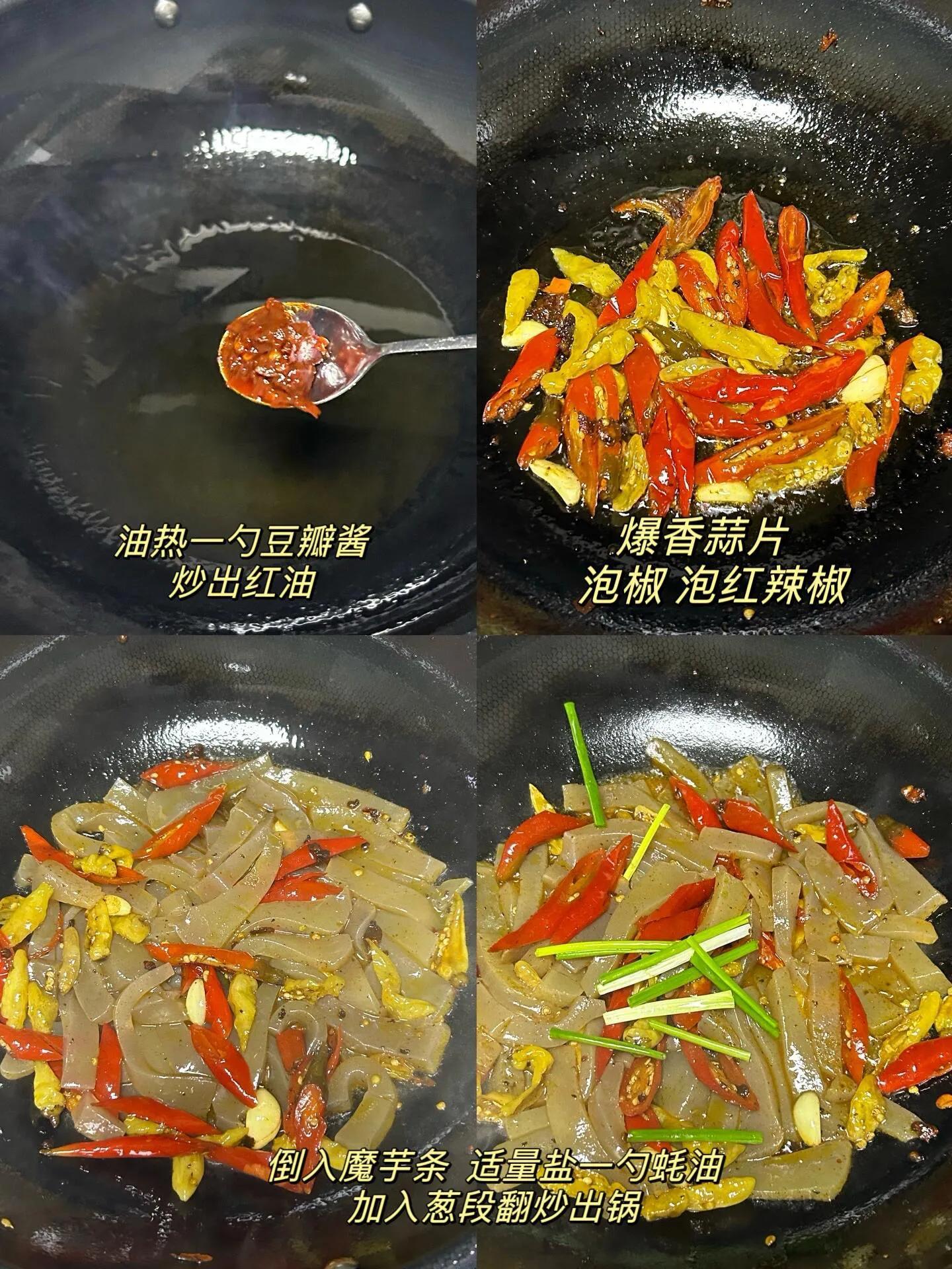 喜欢重口的别错过香辣魔芋: 魔芋是“控糖王者”,零碳水零热量,吸味又有嚼劲。魔芋丝用开水焯1分钟,过凉水更Q弹;热油炒香豆瓣酱和辣椒段,放入魔芋丝翻炒2分钟,加少许盐和葱花,香辣够味,嚼着像辣条,配米饭吃超下饭,吃完还没负担