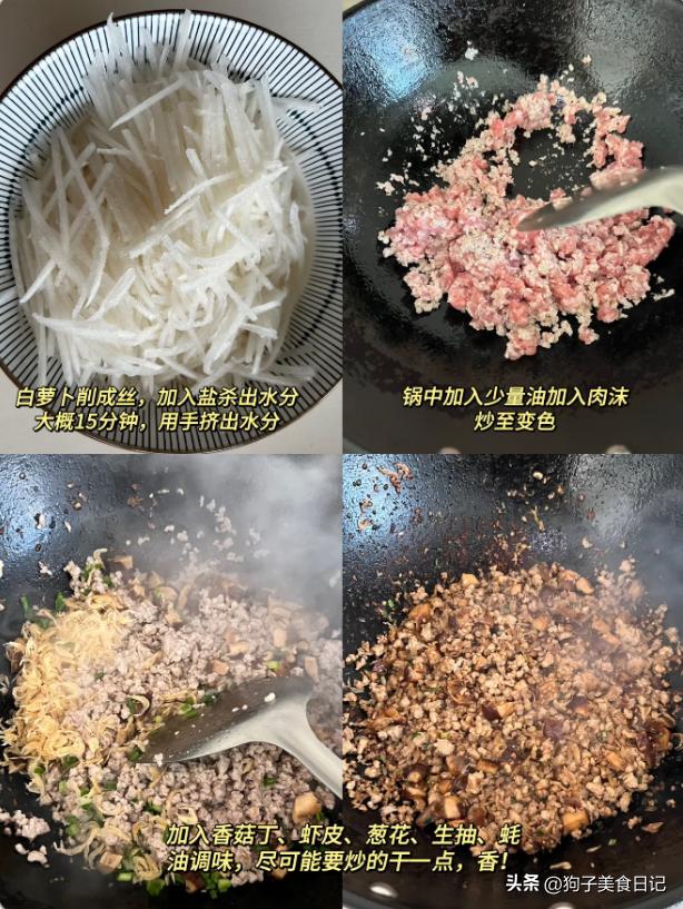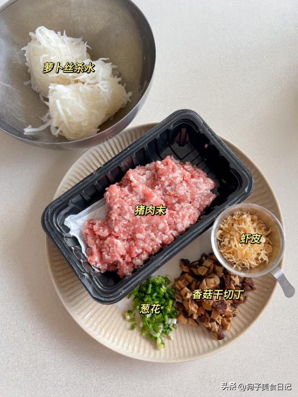 萝卜丸子 材料:适量萝卜丝,适量猪肉末,虾皮,适量葱花,适量干香菇,生抽,蚝油,葱花,红薯淀粉,葱花。
