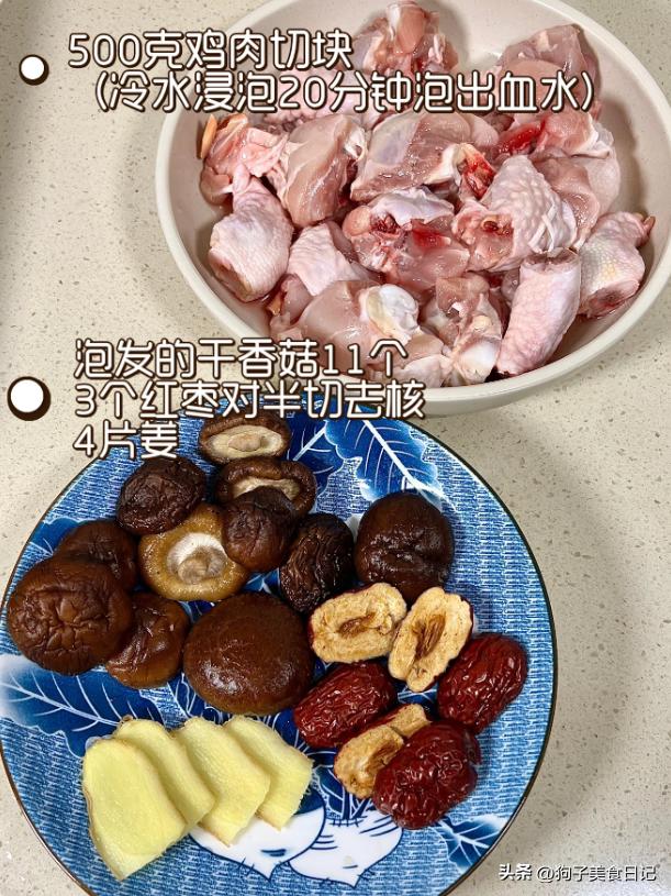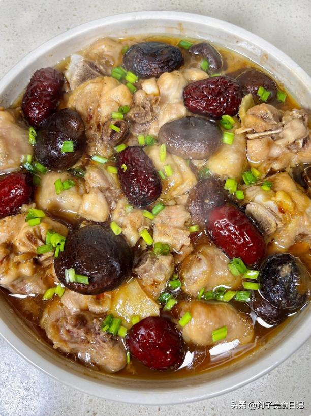 香菇蒸鸡肉 材料:500克鸡肉,适量香菇,红枣,生姜片,白糖,盐,胡椒粉适量,玉米淀粉,小酒,生抽,蚝油,葱花,一勺油。