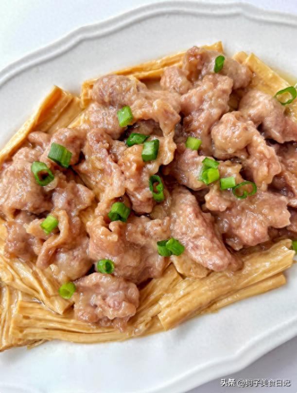 腐竹蒸肉片 材料:适量腐竹,适量梅花肉,玉米淀粉,酱油,蚝油,葱姜,食用油,