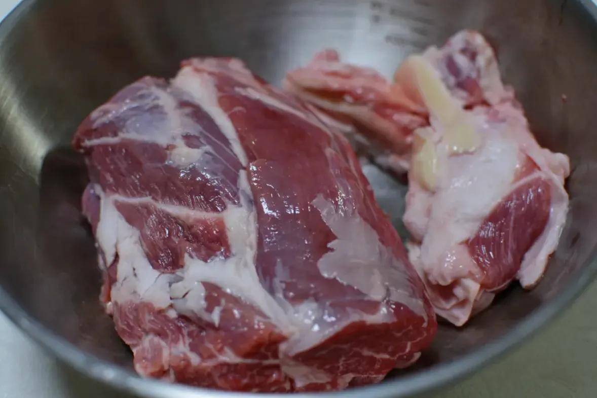 2.将冻鲜的羊腿肉解冻到半软的状态,解冻到还有一点点硬的状态,太软的话切片不太好切;