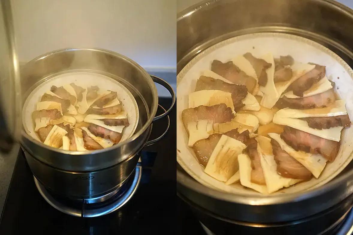 3.酱肉要买得好,不要太咸的,肥瘦均匀的五花肉,就最好了; 4.笋切片,在滚水里烫一烫去涩味,铺一半在盘底,切一点酱肉的边边角角撒上去;