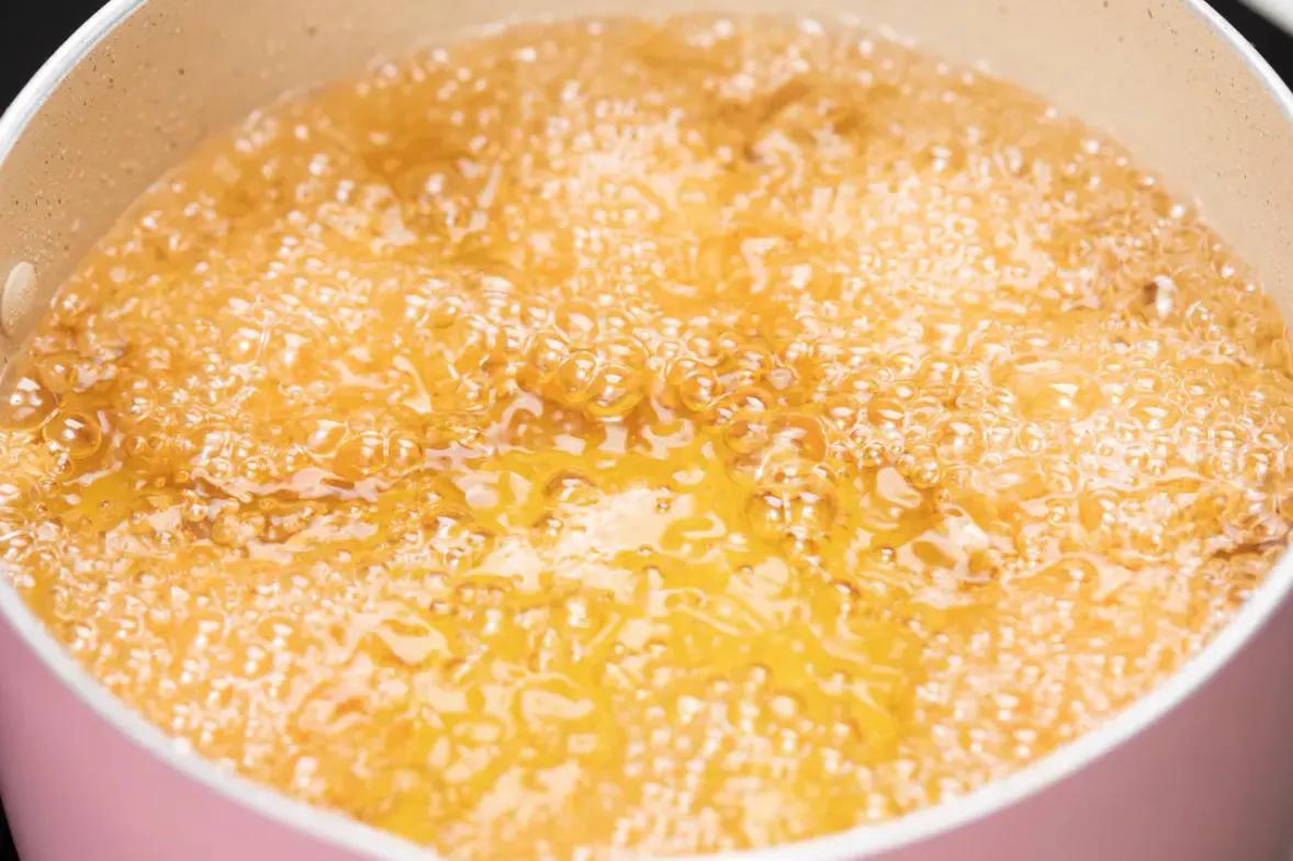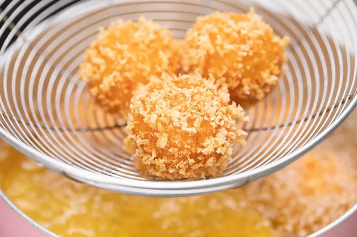 10.裹上面包糠;油锅加热至7成热,即插入筷子有密集的气泡冒出;