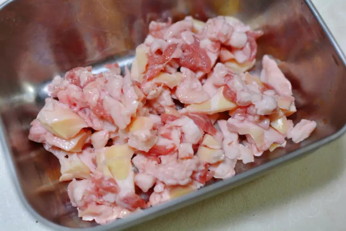 3.把表面筋膜剔除,剔除的筋膜不要扔掉,切碎粒,等会煸油;