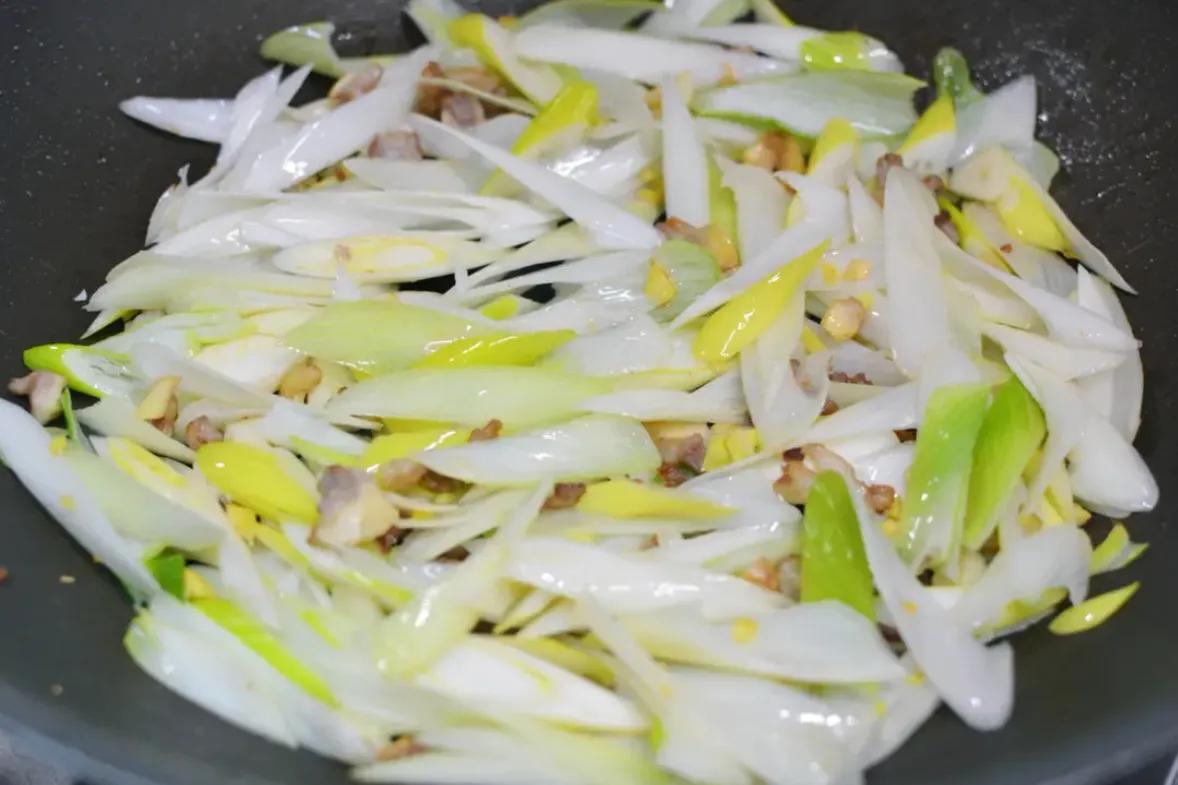 7.接着热锅下油,放入羊筋膜煸香,再倒入姜蒜煸香,接着倒入大葱,翻炒30秒,加一点点盐;
