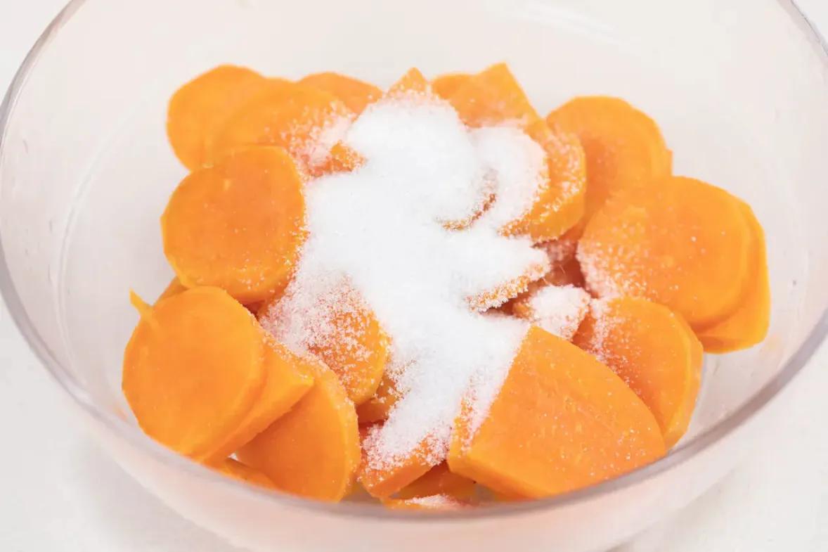 4.加20g细砂糖;(如果你的红薯品种特别甜,也是完全可以不加糖的);