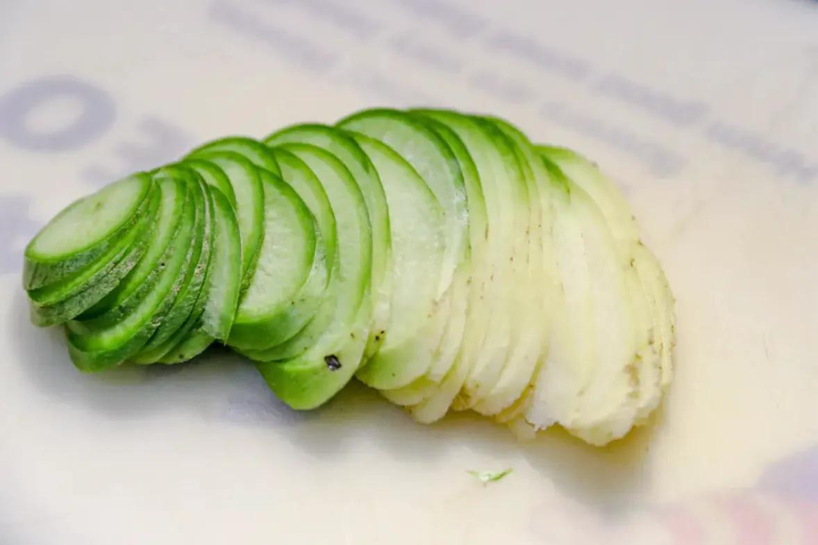 4.羊肉切薄片:半软的状态,改刀切成薄片,放半勺生粉,一点盐和清水抓匀,加点花生油拌匀(锁住水分),腌制10分钟;