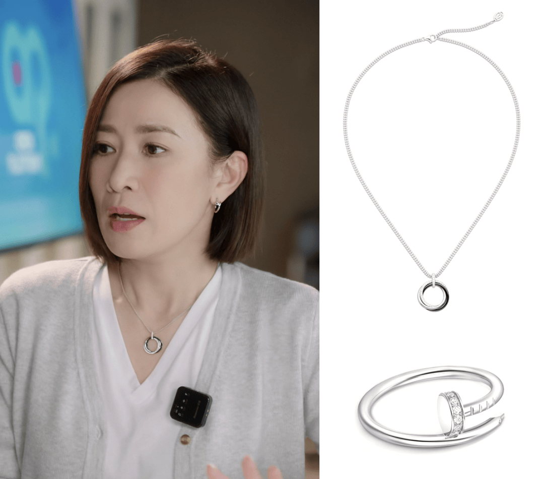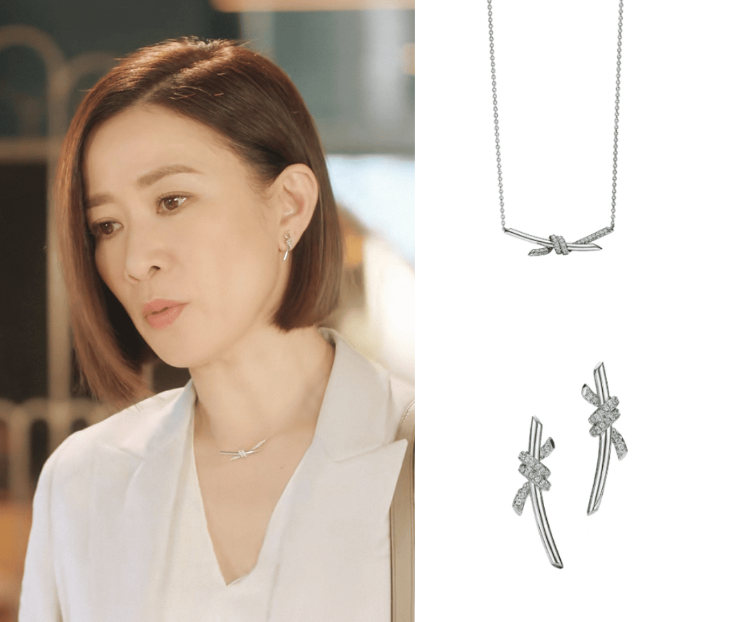 Tiffany Knot系列更是点睛一笔。她选择的是18K白金项链与耳钉,造型足够日常和低调,又有着刚柔并济的风格。而本身的“绳结”寓意,也象征着她在职场里与人的微妙关系,简直像是为她量身定制的。