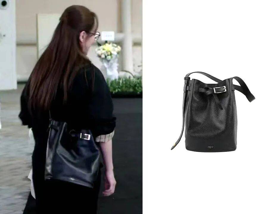 这只小众设计师品牌APEDE MOD的黑色水桶包,皮带扣很点睛,可以斜挎又能装的设计,方便她随时掏出相机和录音笔。