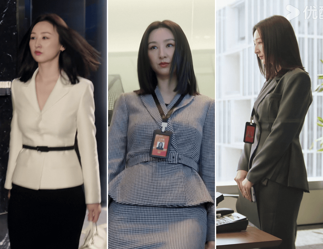 这种“蜂腰”下摆的套装她在剧中穿过好几套,被她驾驭得可圈可点~