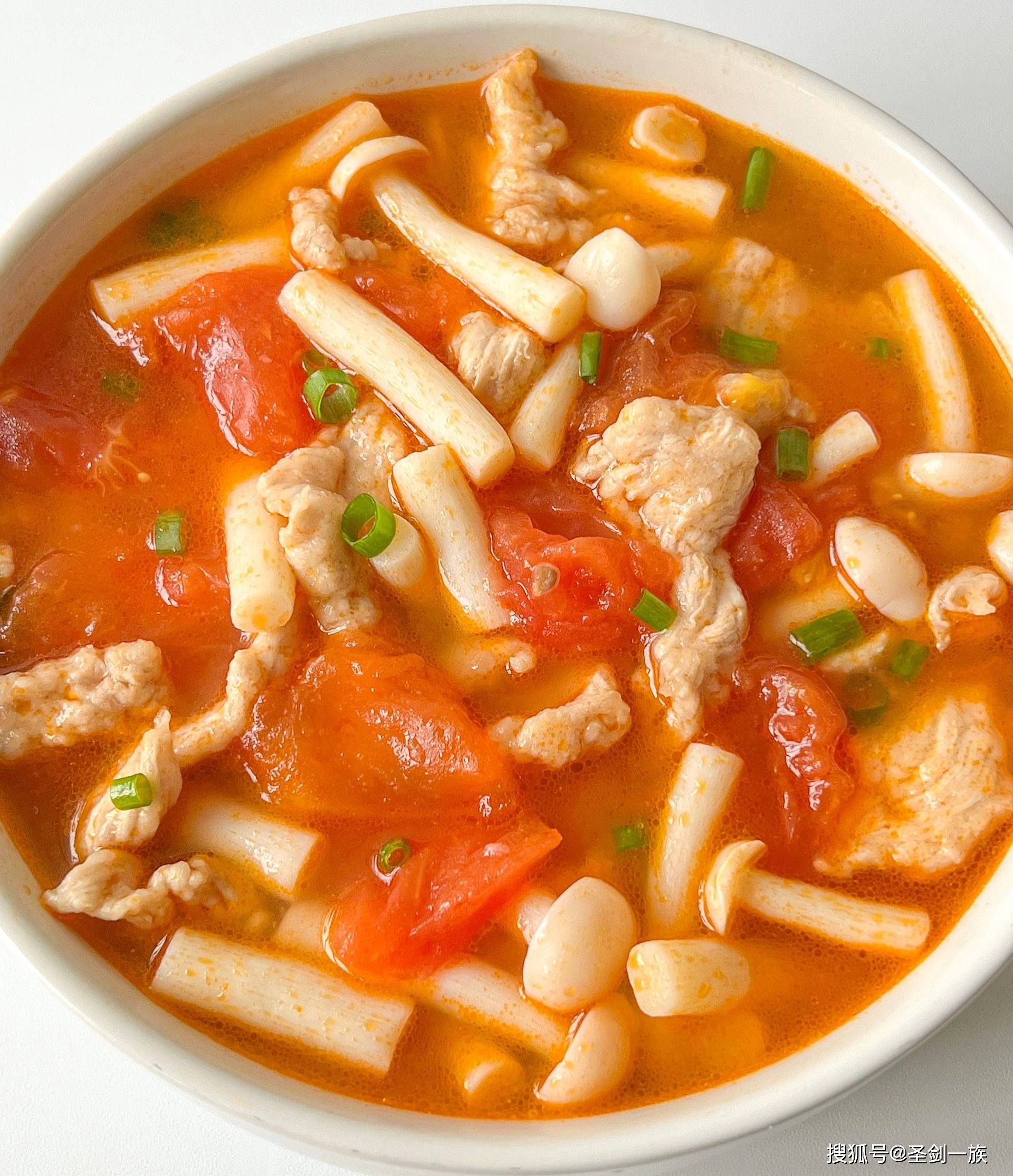准备食材:番茄、香菇、金针菇、口蘑、洋葱、胡萝卜、姜、葱、盐、白胡椒粉、鸡精。 做法步骤: 1、准备3个番茄,洗净后用刀在顶部划十字口,放入开水中烫30秒捞出,去皮后切成小块。准备5朵香菇和一小把金针菇,香菇去根切片,金针菇切去根部撕散;口蘑适量,洗净切片。洋葱半个切丝,胡萝卜半根切成薄片备用。 2、起锅烧油,油热后放入葱段、姜片、洋葱丝,小火煸炒出香味,倒入番茄块,中火翻炒至番茄软烂出汁。 3、加入香菇片、口蘑、胡萝卜片翻炒均匀,倒入约一锅清水,大火煮开后撇去浮沫。 4、放入金针菇,加入1勺盐、少许白胡椒粉、1勺鸡精,转中火煮5分钟,让汤汁充分吸收食材的鲜味。 5、汤色呈现浓郁的番茄红,味道鲜香酸甜时,撒上少许葱花点缀,即可盛出享用。 五、胡萝卜炒鸡蛋