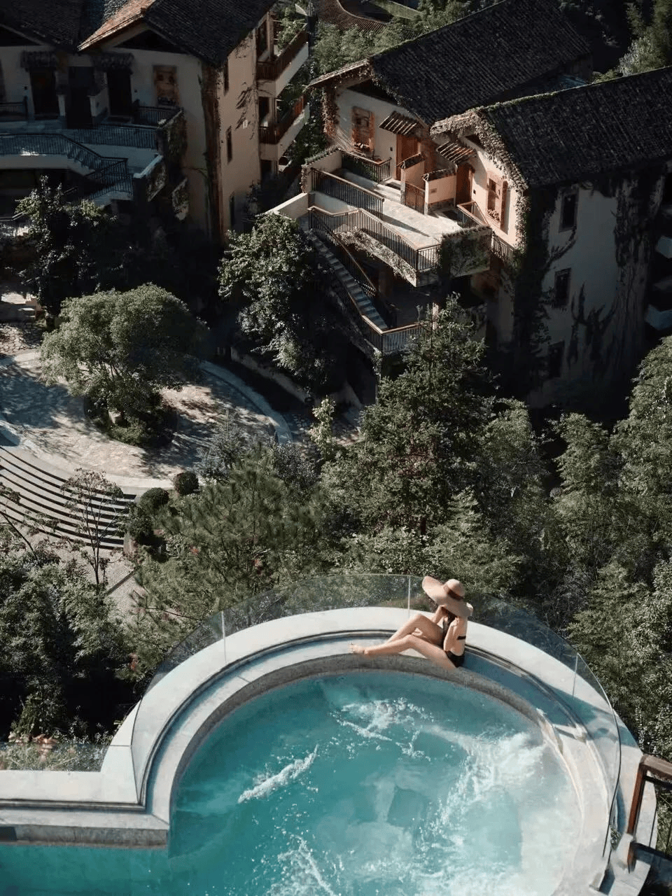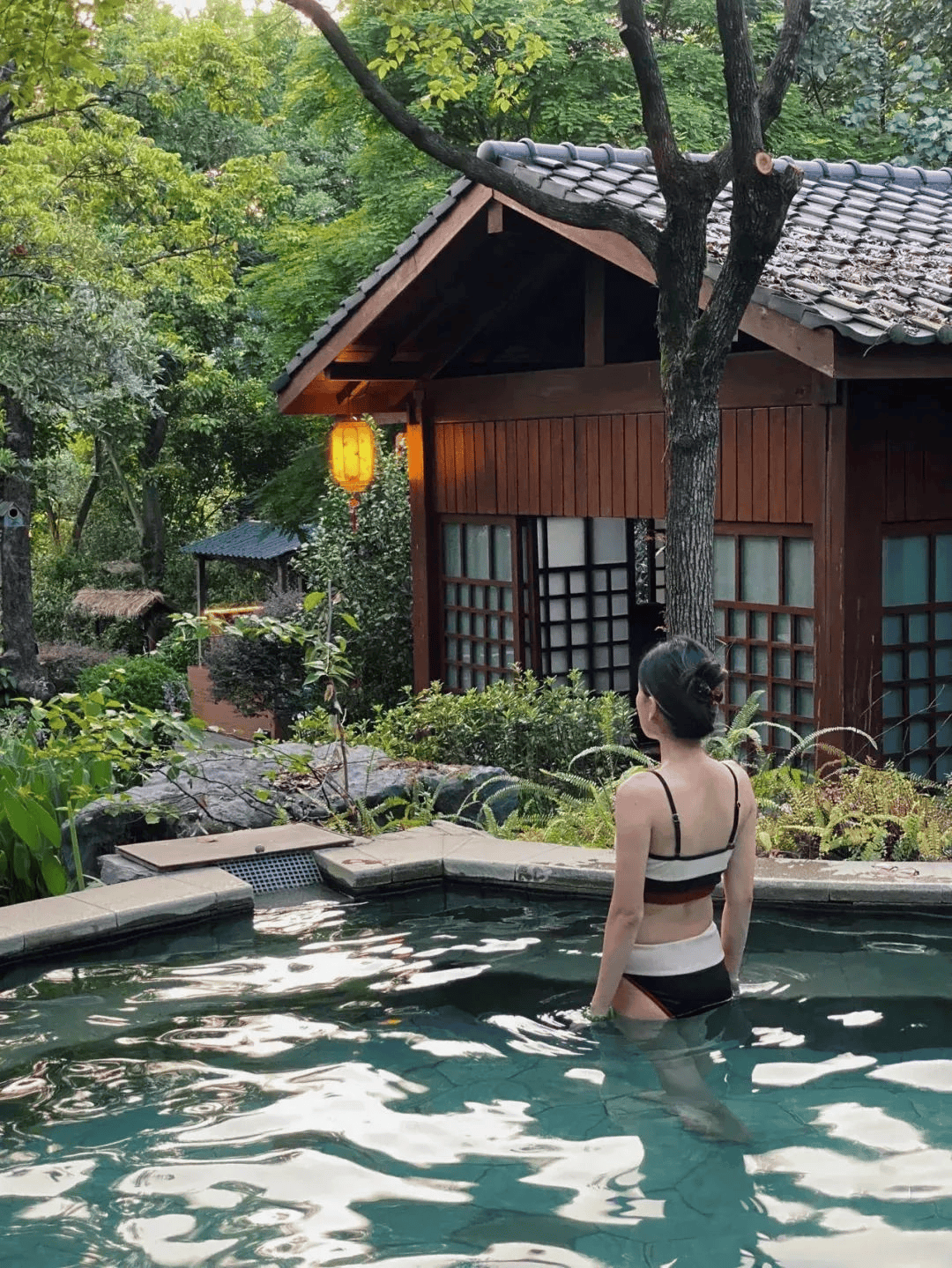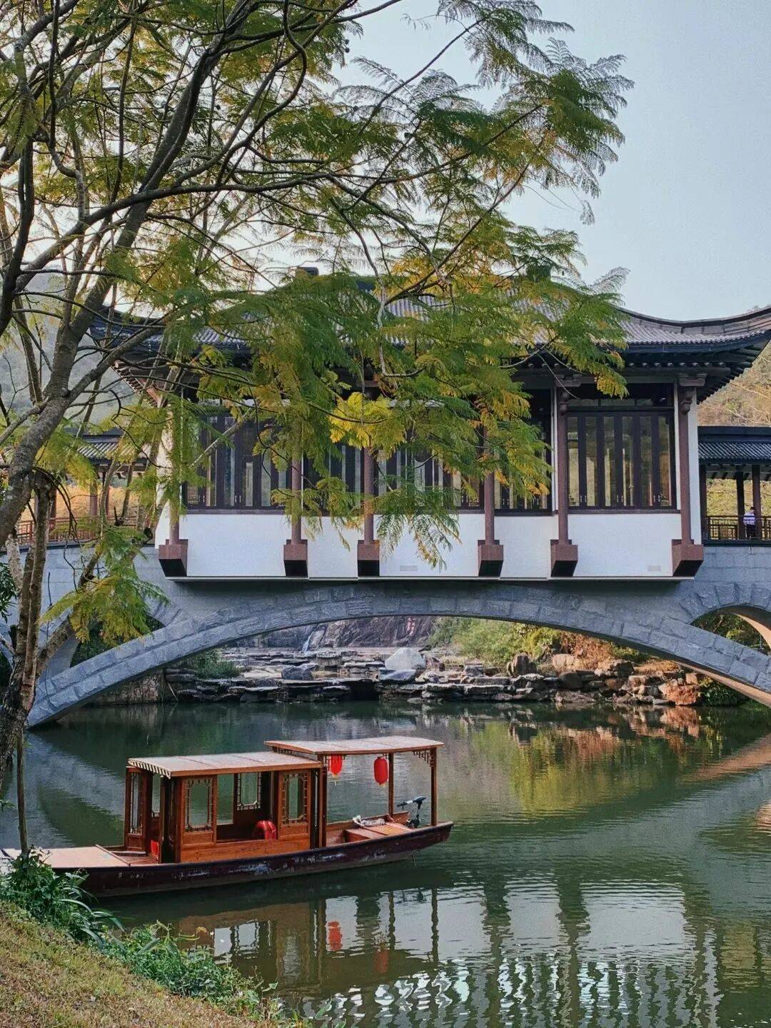 整个汤泉也像是一处“小江南”,漫行在古色古香的徽式建筑间,走过了白墙黛瓦,飞檐翘角,仿佛一秒就穿越古今。