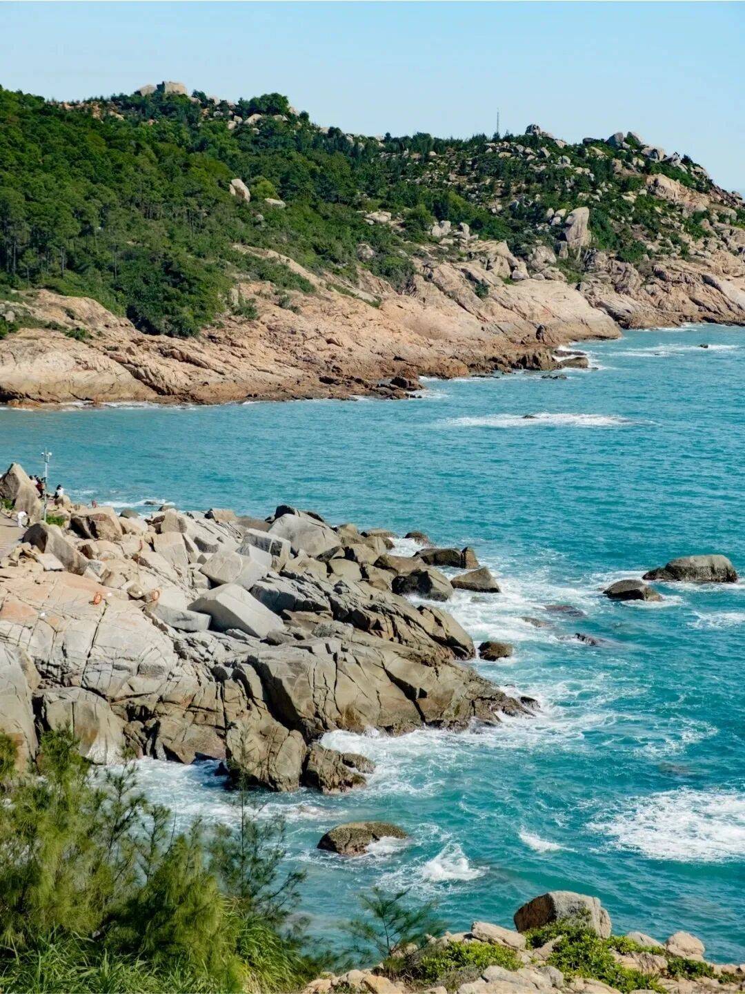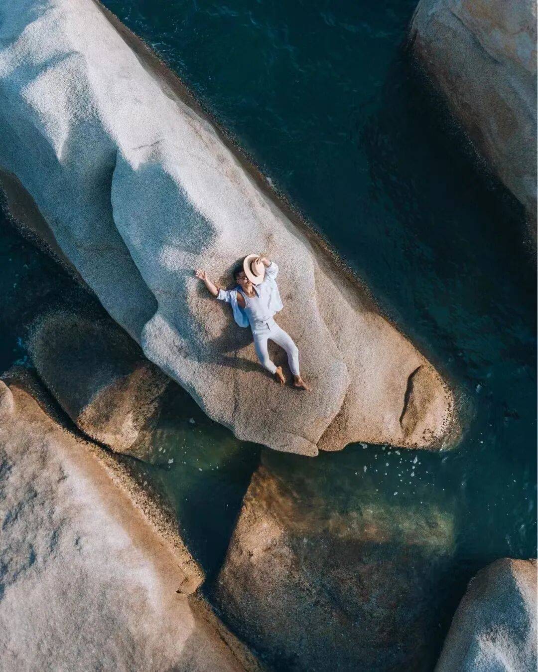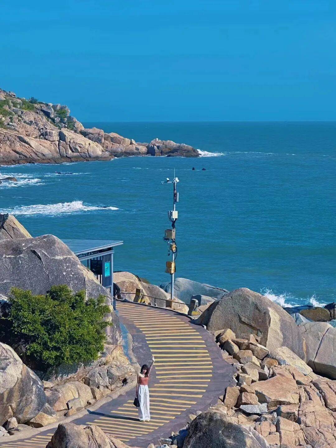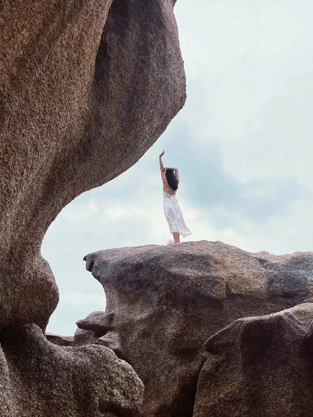 你可以坐在石头之上,看耸立的巨石与湛蓝的海水,交织成了一片瑰丽的海边石林,甚至还有一块风动石,被载入了《中国国家地理之最》。