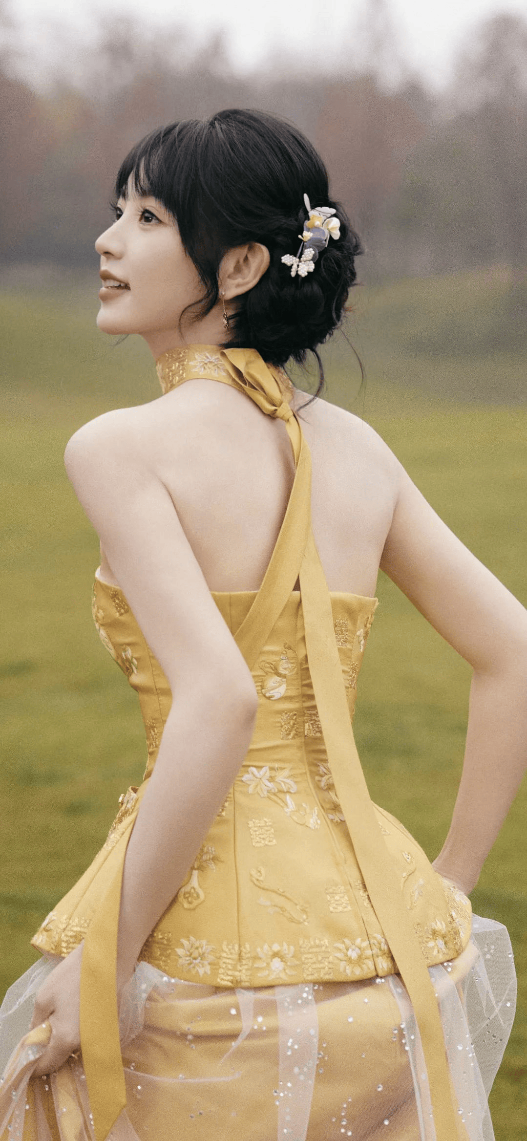 轻盈的纱质面料上点缀着细密波点刺绣,挂脖飘带轻绕颈间,勾勒出优越的肩颈线条,花苞式裙摆则巧妙修饰身形,整体造型宛如一块融化在月光下的“黄油小蛋糕”,甜美而不腻,温柔又灵动,瞬间引爆社交平台。